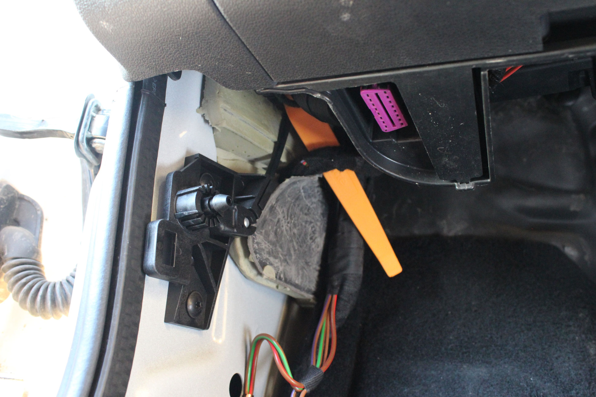 Подключение шины LIN. Делаем тоже по инструкции старлайна. Снимаем ручку открытия капота (не очень понятная процедура, если делаешь первый раз!). Фото не делал, сам искал на Драйве инфу, как её снять. Потом снимаем пластиковый кожух за ним. В жгуте водительской двери находим фиолетово – чёрный провод и подключаемся к нему в разрыв. Бело – зелёный провод от разъёма сигнализации подключаем к фиолетово – чёрному проводу, идущему в дверь. Белый провод от разъёма сигнализации подключаем к фиолетово – чёрному проводу, идущему в авто.