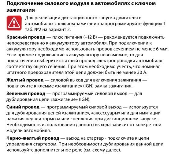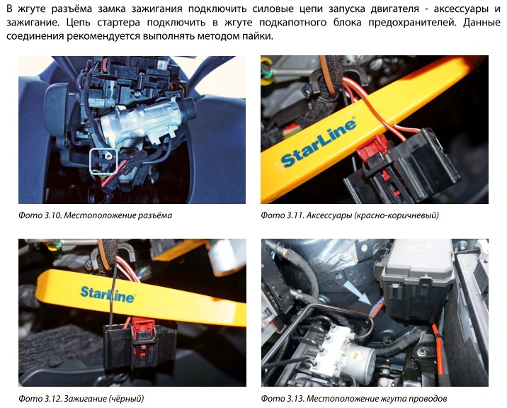 Далее нужно подключить силовой модуль. «В жгуте разъёма замка зажигания подключить силовые цепи запуска двигателя — аксессуары и зажигание. Цепь стартера подключить в жгуте подкапотного блока предохранителей. Данные соединения рекомендуется выполнять методом пайки» — гласит инструкция.