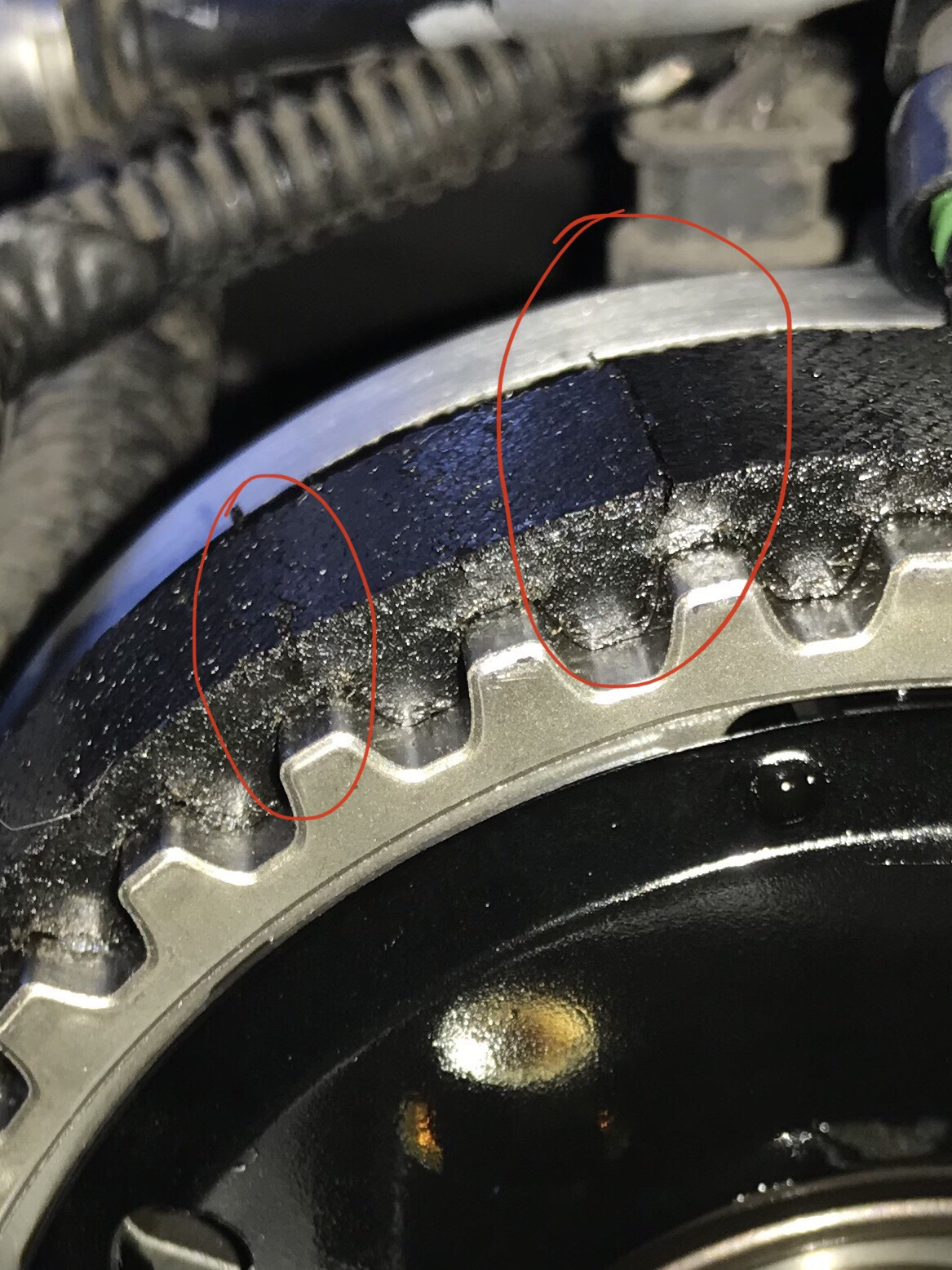 Но меня очень смутила одна большая и одна маленькая трещина на ремне ГРМ. На фото ниже видно. Мастер говорит, что для ремня ГРМ ecoboost 1.0 купающегося в масленной ванне это норма и заморачиватся не стоит (мол при разборе новых двигателей ремни в похожем состоянии и что ремень армирован и не порвётся), а я вот сон потерял. Ссыкотно как-то, так как при обрыве ремня гнёт клапана. Кто что думает по поводу состояния ремня? Паниковать и менять (стоит это ооооочень дорого, так как нужно пол двигателя разобрать, при том, что сам Форд регламент для замены ремня предусмотрел 10 лет или 200т.км) или ездить и забить? Мастер сказал, что нужно поменять на 120тыс, а пока не трогать.