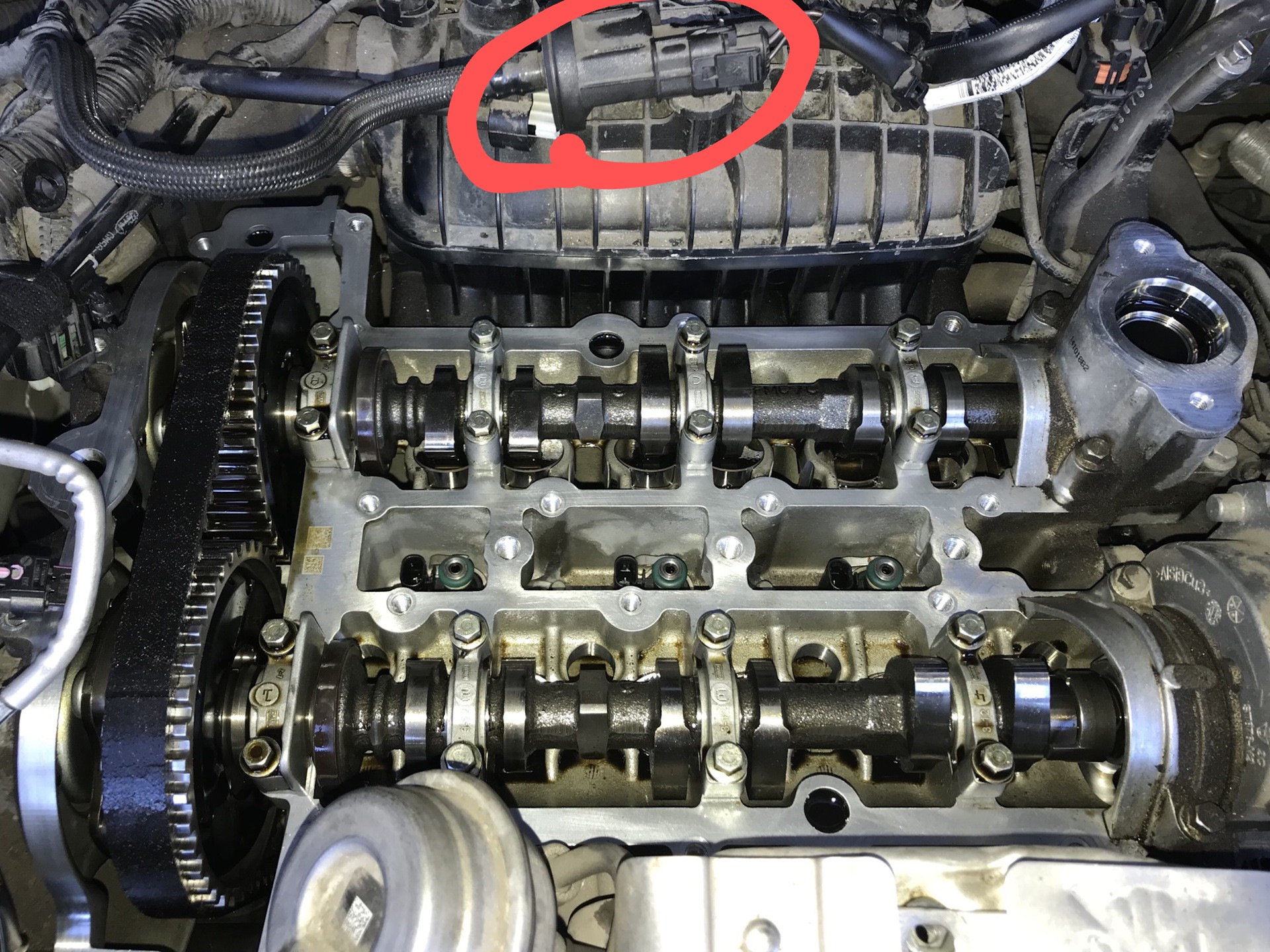 Всем привет. Вот и наступил день, устранить проблему. Так как все з/ч для этого предварительно были закуплены, записался к официалам на проведение работ. Фотооотчет состояния распредвалов двигателя и ремня ГРМ ecoboost 1.0 при пробегe 55850км прилагаю. Распредвалы как новые. Оригинальное масло Castrol рулит!