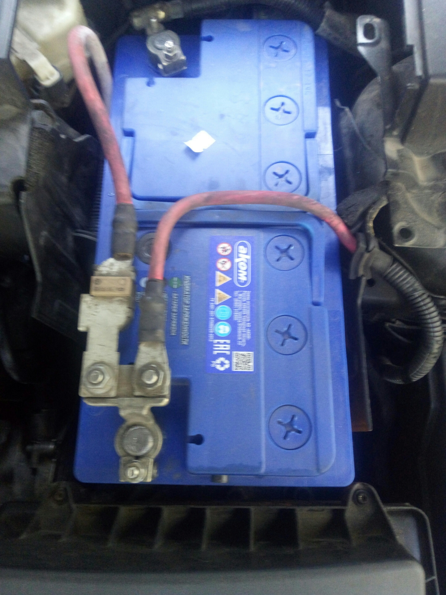 Снял аккум сам (рекомендуют снимать сперва минусовую, а потом плюсовую клеммы), а вот поставили они его мне сами, померили утечку и заряд от генератора.