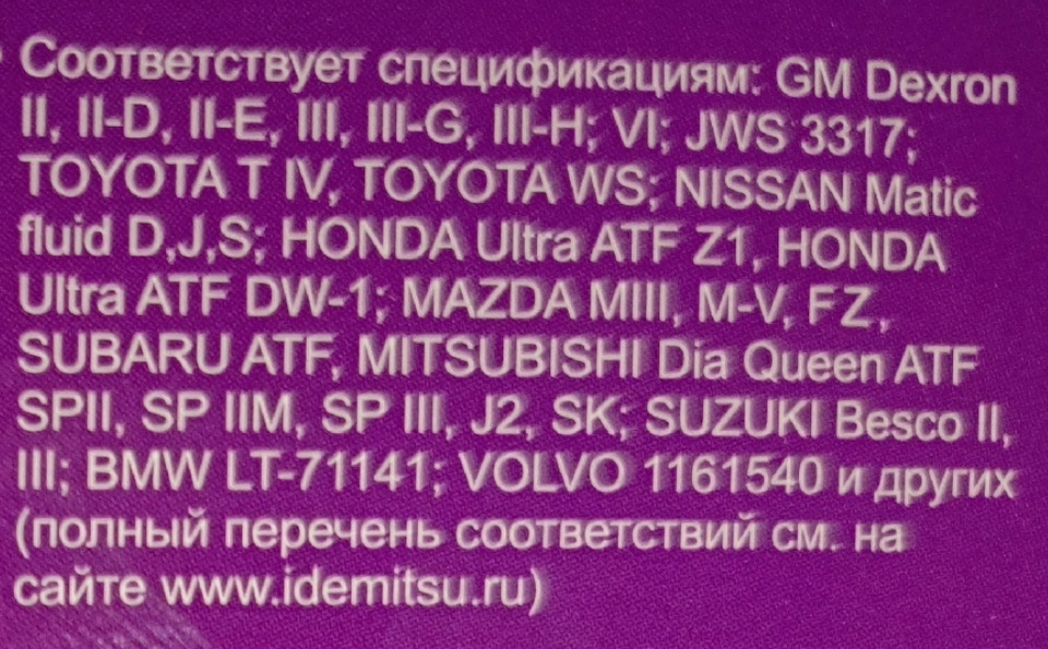 Но нашёл idemitsu atf допуски подходят, но у меня возник вопрос если допуски подходят почему его не льют, почему берут тейп-м или фордовский mercon пятый.