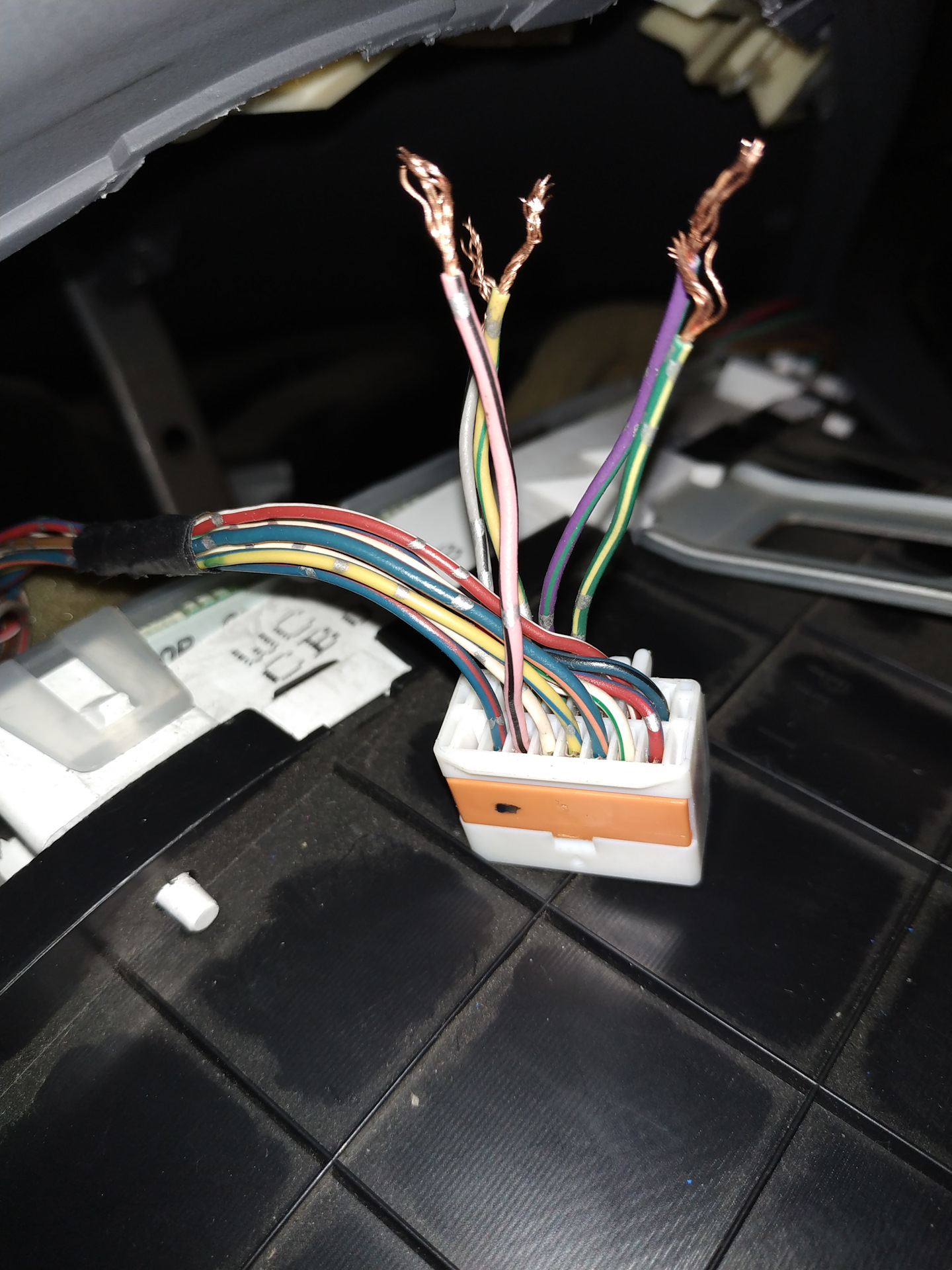 Жёлтый с зелёной полосой и серый с черной полосой идут в фишку часов, жёлтый с черной полосой совпадает по цвету, а серый с черной полосой из приборки соединяет с розовым с черной полосой в фишке часов. Фиолетовый с зелёной полосой тоже идёт в фишку часов и там соединяется с красным проводом. Розовый с черной полосой лишний, его можно убрать из фишки панелидатчик уличной температуры