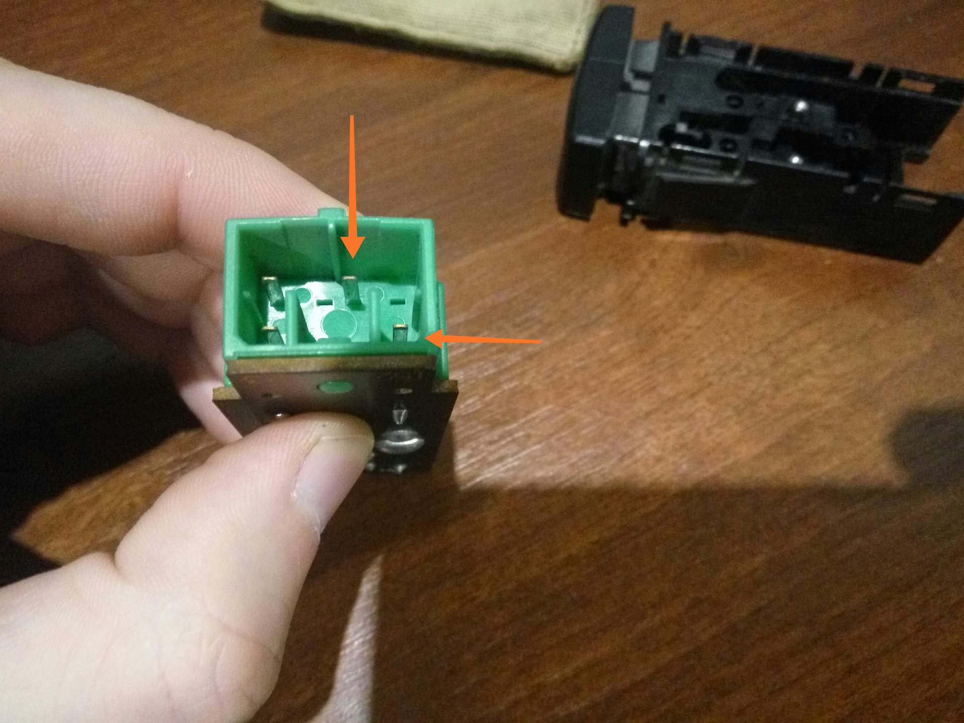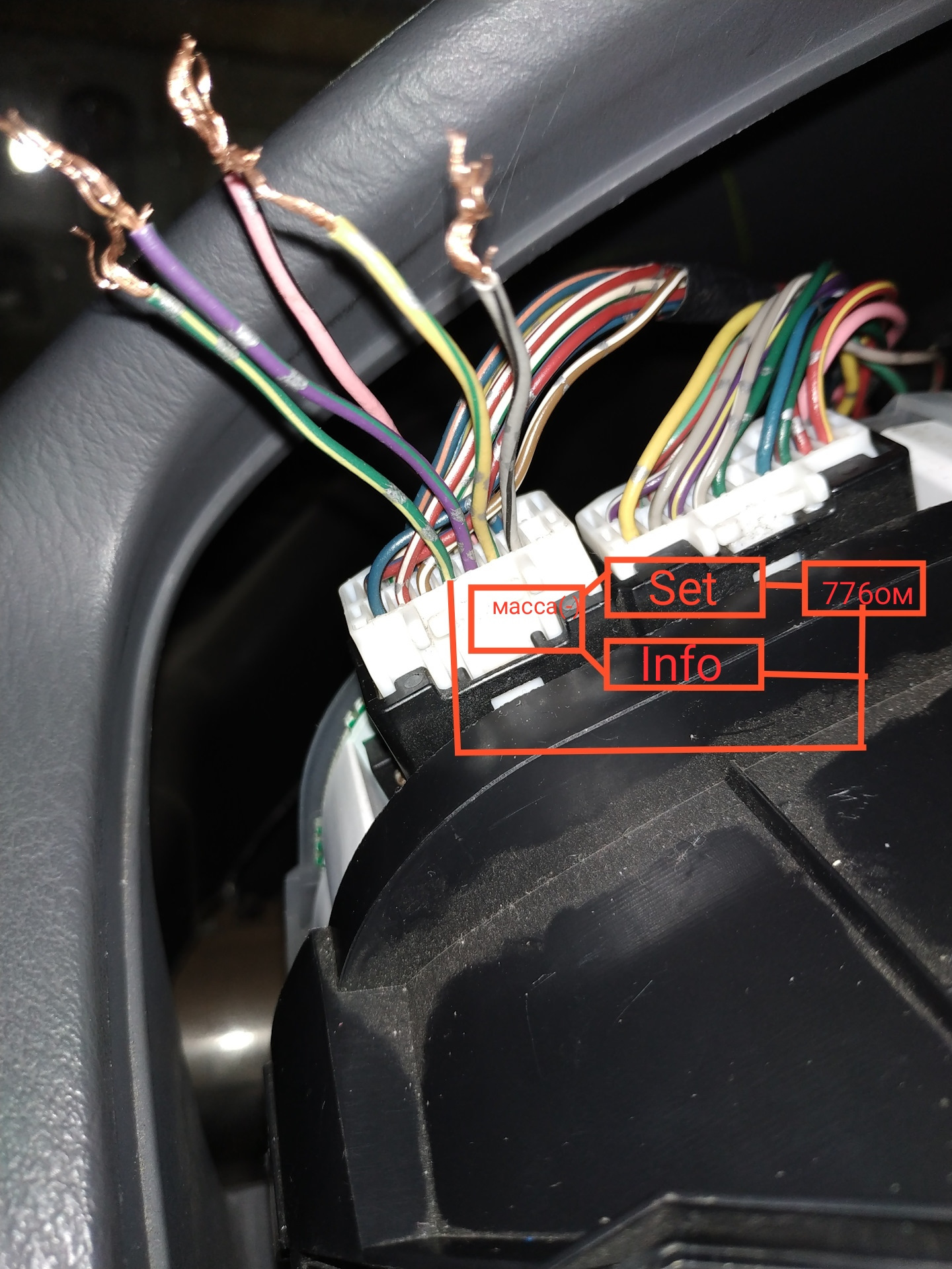 Если у вас есть кнопка set/info, то нужно будет протянуть провод с приборки к кнопке и подключить их к контактам обозначенным стрелками, к одному контакту(любому) зелёный с жёлтой полосой, к другому минус(-), брал от соседних кнопок. Чтобы работала подсветка кнопки, нужно протянуть от любой соседней кнопки (+) и (-) к оставшимся контактам, полярность не важна.