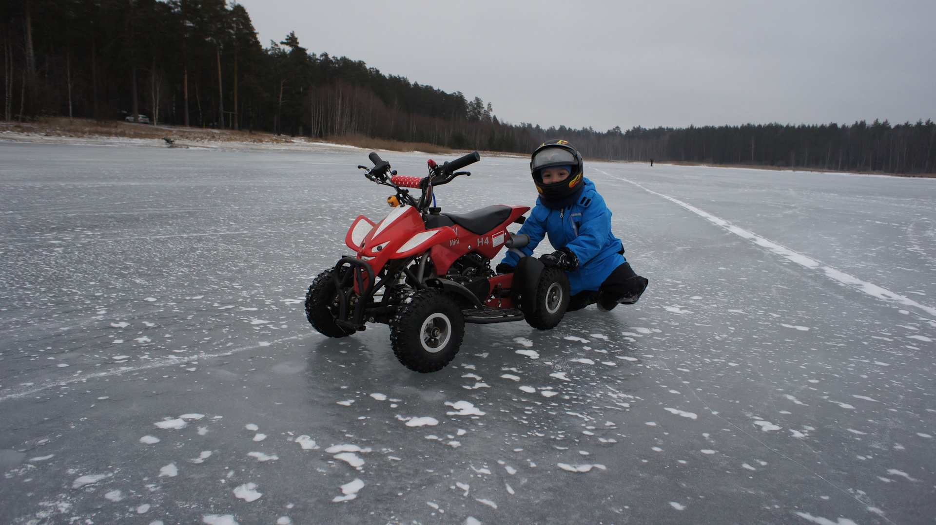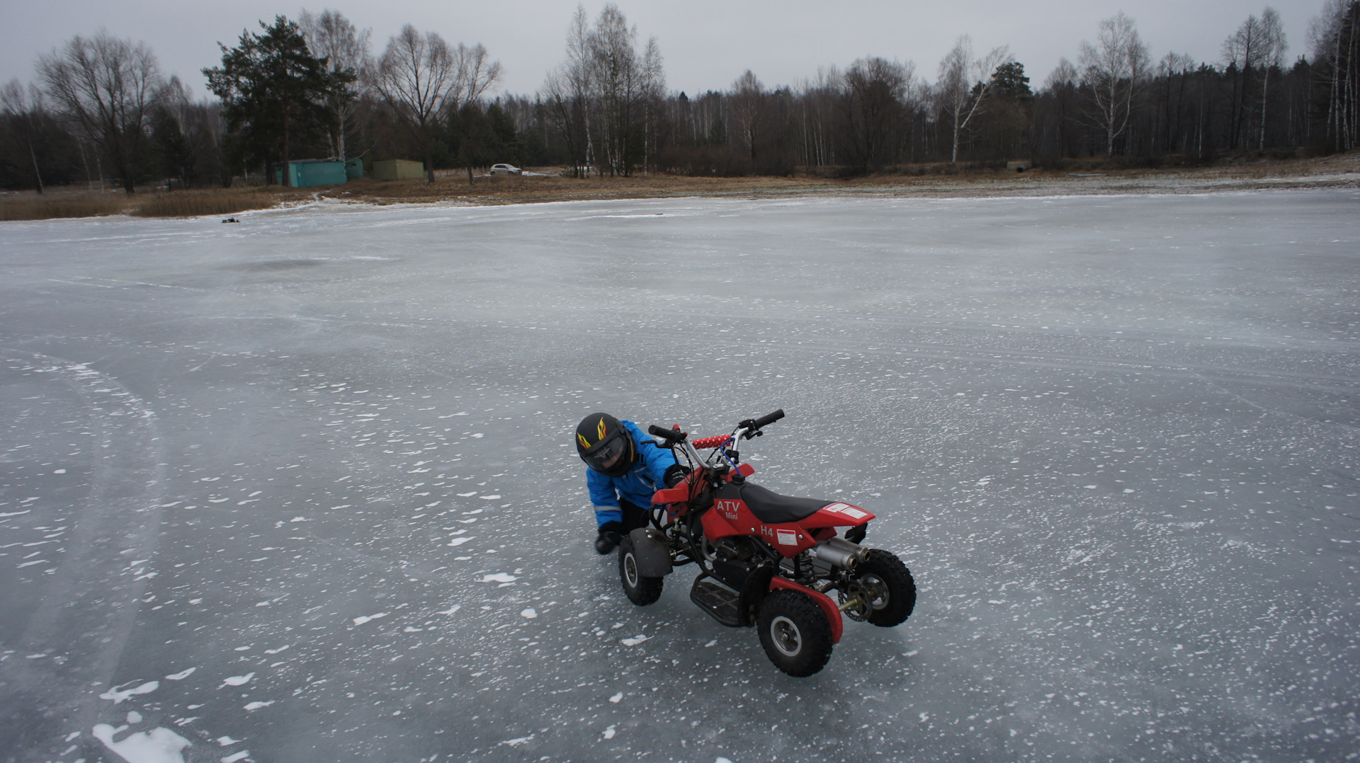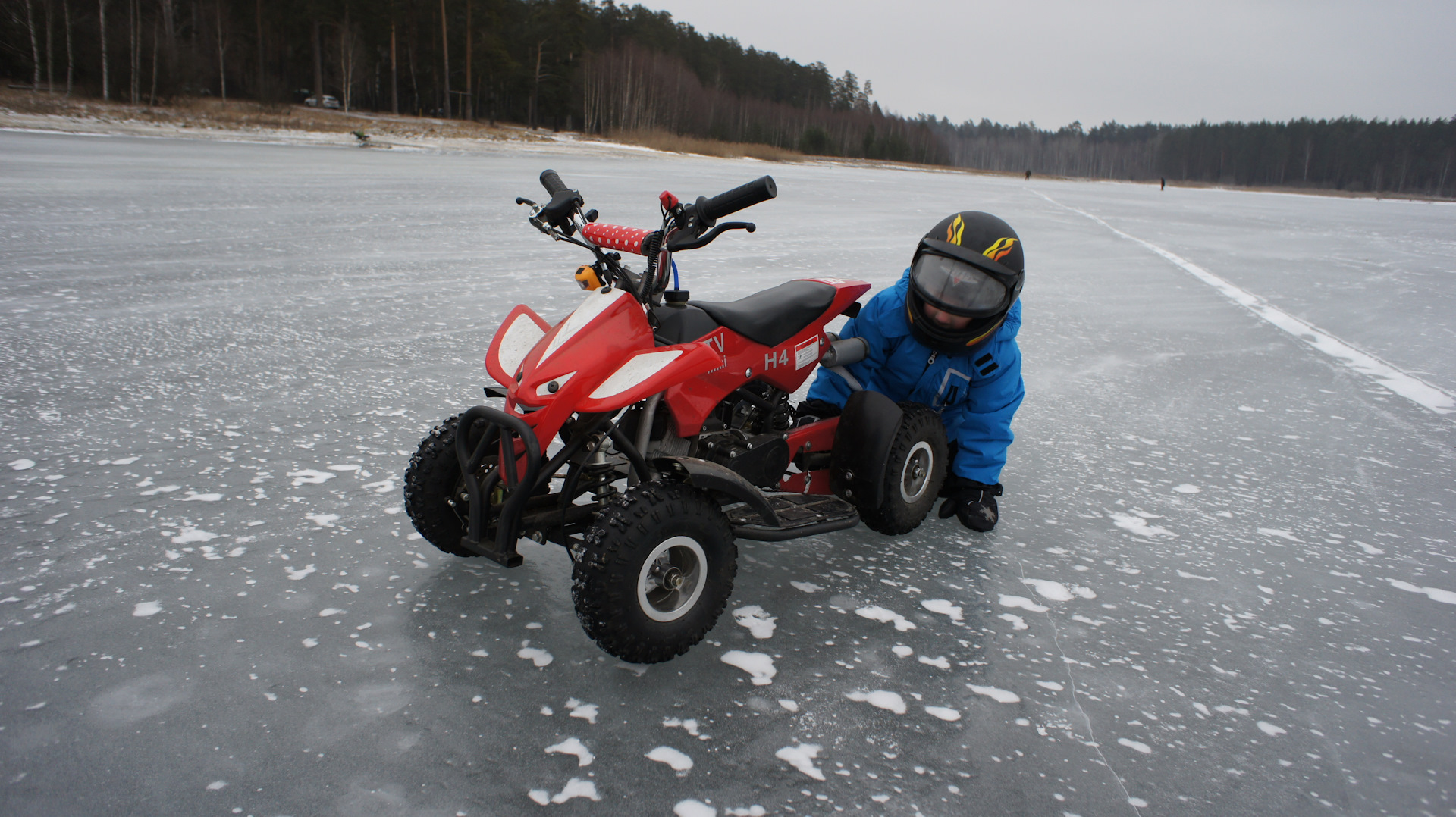 Субботнее утро выдалось на редкость удачным: минус 6 градусов по Цельсию, ветер не сильный, без снега. В компании с женой, сыном и моим другом мы отправились в сторону одного из ближайших озёр. Подъехав к озеру, я оценил обстановку: лёд хоть и бугристый и весь в трещинах, но достаточно толстый чтобы выдержать 120кг суммарного веса. Разгрузили, заправили технику. Пустили, прогрели технику, одели шлемы и в бой!