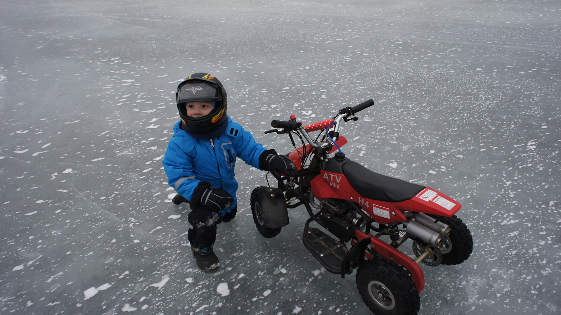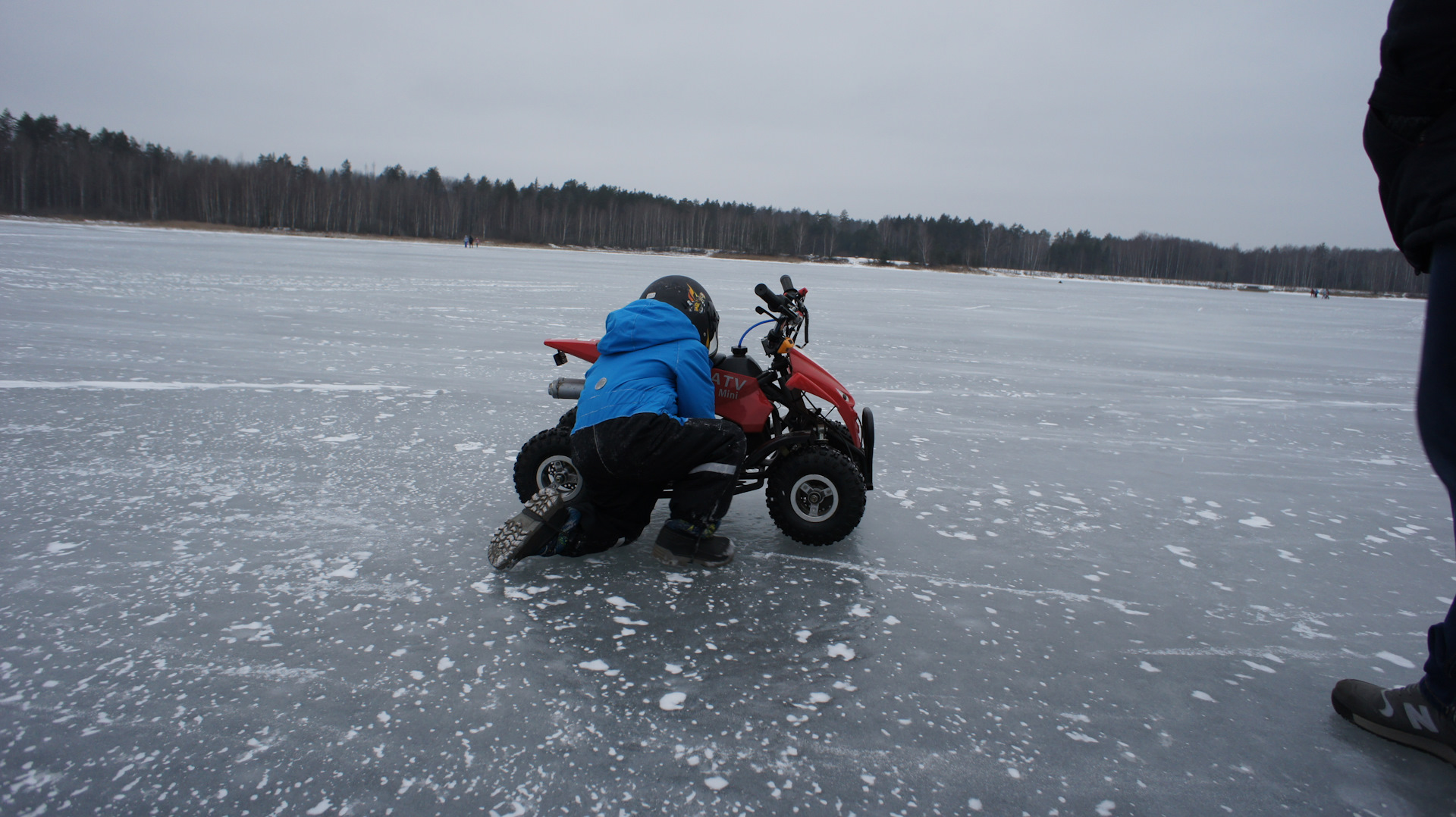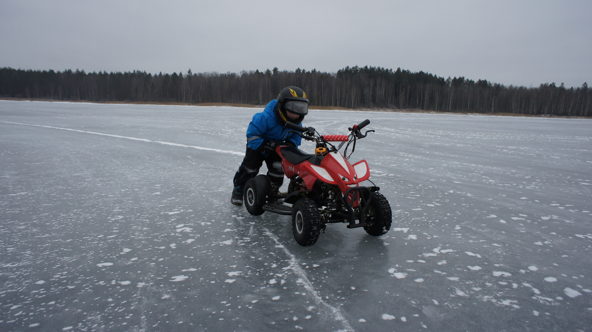 Субботнее утро выдалось на редкость удачным: минус 6 градусов по Цельсию, ветер не сильный, без снега. В компании с женой, сыном и моим другом мы отправились в сторону одного из ближайших озёр. Подъехав к озеру, я оценил обстановку: лёд хоть и бугристый и весь в трещинах, но достаточно толстый чтобы выдержать 120кг суммарного веса. Разгрузили, заправили технику. Пустили, прогрели технику, одели шлемы и в бой!