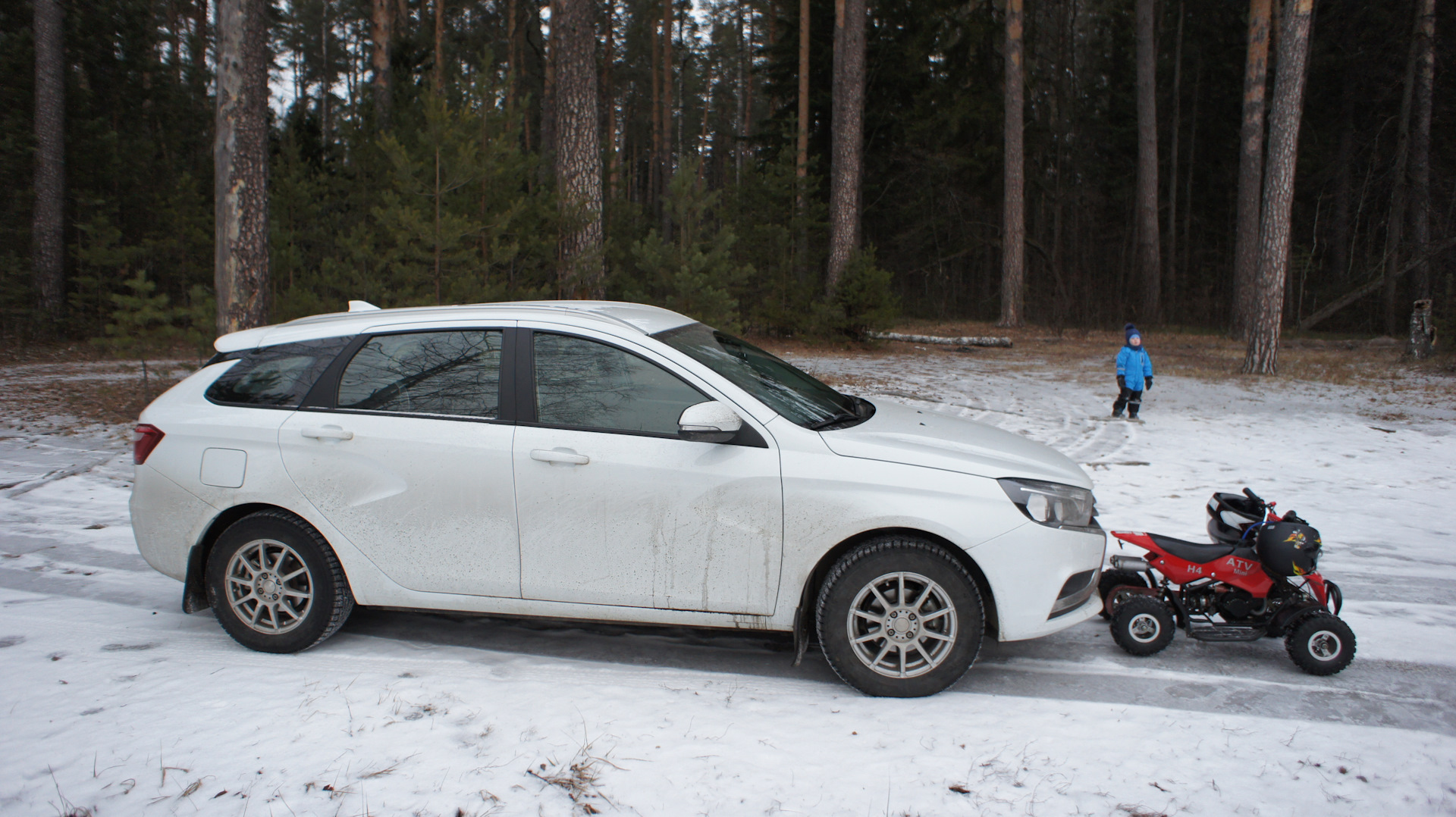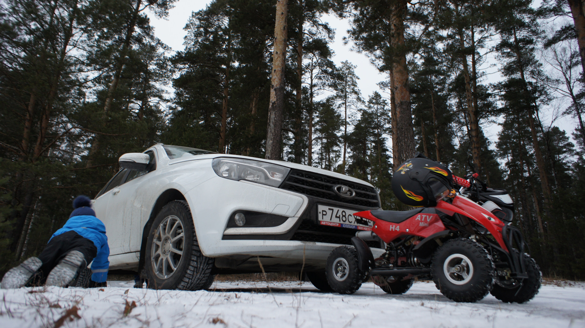 Никто не пострадал (пара ссадин на моей ноге не в счёт). Оператор замёрз, и мы отпустили его погреться в машину. А сами поехали вверх по течению и оказались в извилистом русле замёрзшего ручья. Когда на льду начались проломы, я решил что ехать уже небезопасно из-за риска попадания колеса в пролом и вероятного падения. Только мы развернулись как у нас порвалась цепь… До машины далеко… Позвонил своей «группе технической поддержки». Оператор переквалифицировался в поисковика-спасателя, началась операция по нашему спасению. По телефону я попросил посигналить, а сам отозвался стрекотом квадрика. Так мы определили наше взаимное расположение на местности. Вскоре за деревьями я увидел ближний свет своей Весты. Подъехать ближе к берегу спасатели не смогли из-за сложного рельефа местности. Пришлось толкать обездвиженный квадрик самому. Однако этот инцидент не смог испортить нам настроение. А квадрик мы позже обязательно починим.