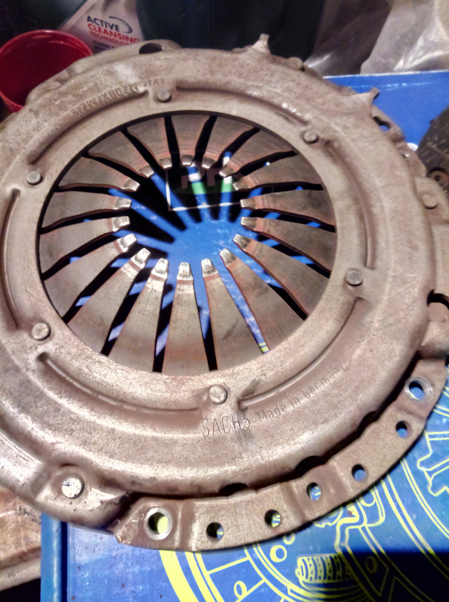 за последнее время особо ничего с Гольфом не происходило, из замен поменял тройник пластиковый на головке, старый потек…загудел правый ступичный задний, заменил на SKF смазки чуть добавил при установке…наконец-то заменил лобарь, поставил фирмы XYG…ставил в фирме автотрейд…из последних событий при возвращении с работы домой загудел выжимной подшипник (при съеме развалился в руках…выпала внутренняя обойма…шарики сухие как из Сахары, решил махнуть весь комплект взял фирмы Валео VWK-102, из комплекта почему-то не подошла корзина сцепы, ведомый диск встал вплотную вообще без зазоров в посадочное место маховика, выжимной подошел один в один, а вот корзина оказалась больше в диаметре…пришлось ставить старую, благо она в хорошем состоянии оказалась.ни проточек, ни просадки лепестков…все собрал, сразу скажу ставить коробку одному практически нереально, просил другана подсобить…после установки привыкаю к сцеплению, раньше сцепление брало в конце, а сейчас только чуть отпустил и уже поехала…дергался первое время как школьник, по первым ощущениям педаль сцепления стала мягче…как-то так…будут новости напишу