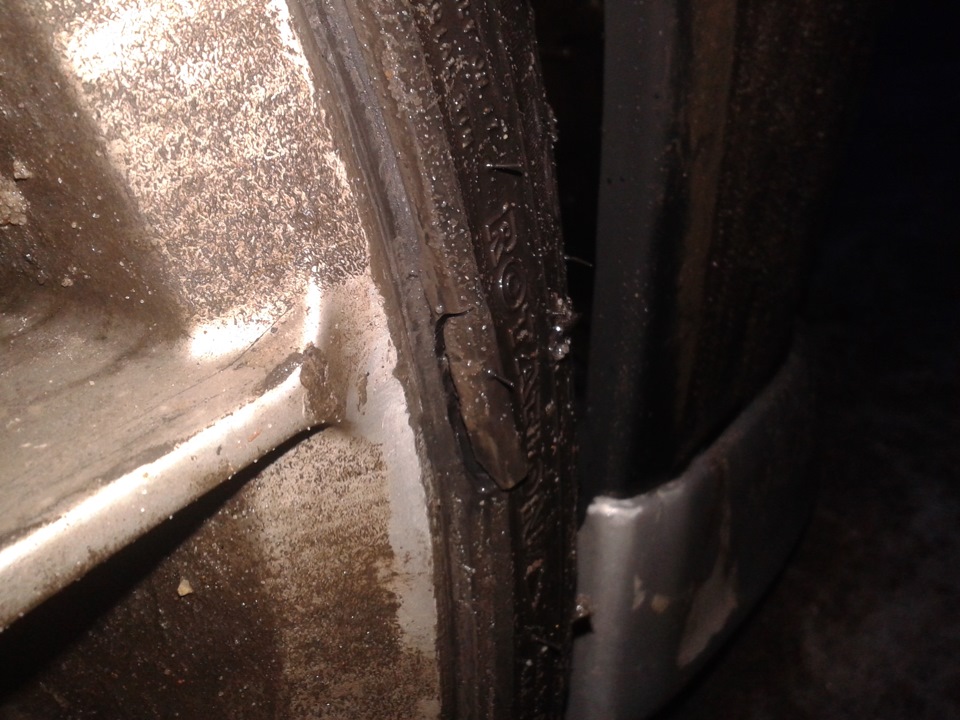 В своём прекрасном городе — поймал яму ужасную. На повороте — 15 км/ч, оп и погружение — поскольку борты усиленные удар получился кромкой диска в борт усиления шины и на сквозняк — дальше интересней — ключи, гайки, латки, сырость, мат и победа)))