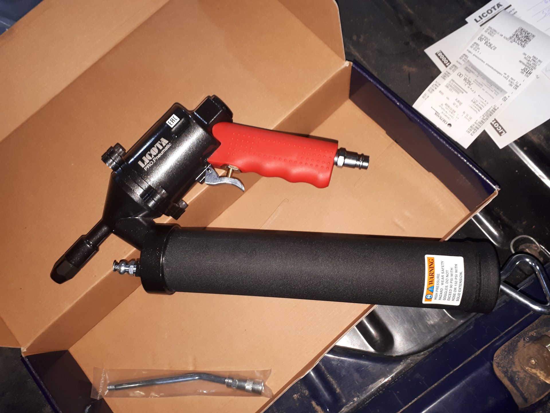 Всем привет. Мой товарищ и напарник, работает еще на скорой водителем и механиком. Получают они в конце декабря 20 с лишним новых машин. И всем нужно будет быстро сделать ТО, поменять масло, протянуть подвеску и прошприцевать шкворни. Вот прикупил под это дело пневмо присрособу. По описанию проф. уровня, с непрерывной подачей. Вот скоро испытаю.