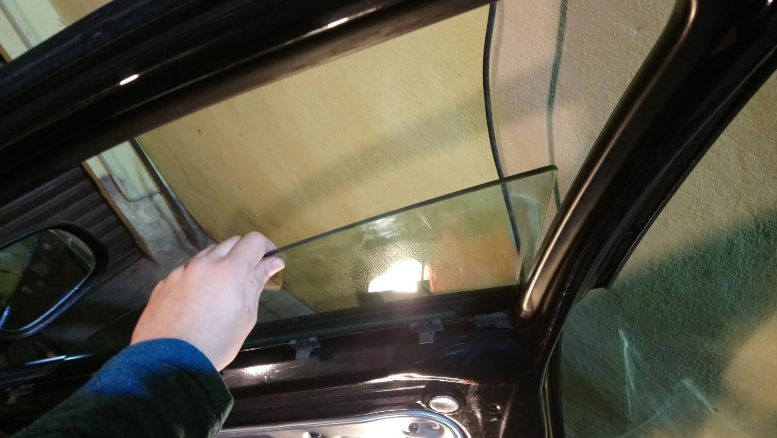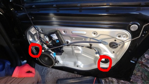 Но бывает и как у меня, просто ослабли болты, которые затягивают крепления стекла с двух сторон. Тут будет достаточно снять обшивку и затянуть крепления, находящиеся внутри под черными заглушками (на фото видно заглушки. Одна на северо-западе от большого динамика, вторая идет ниже замка)