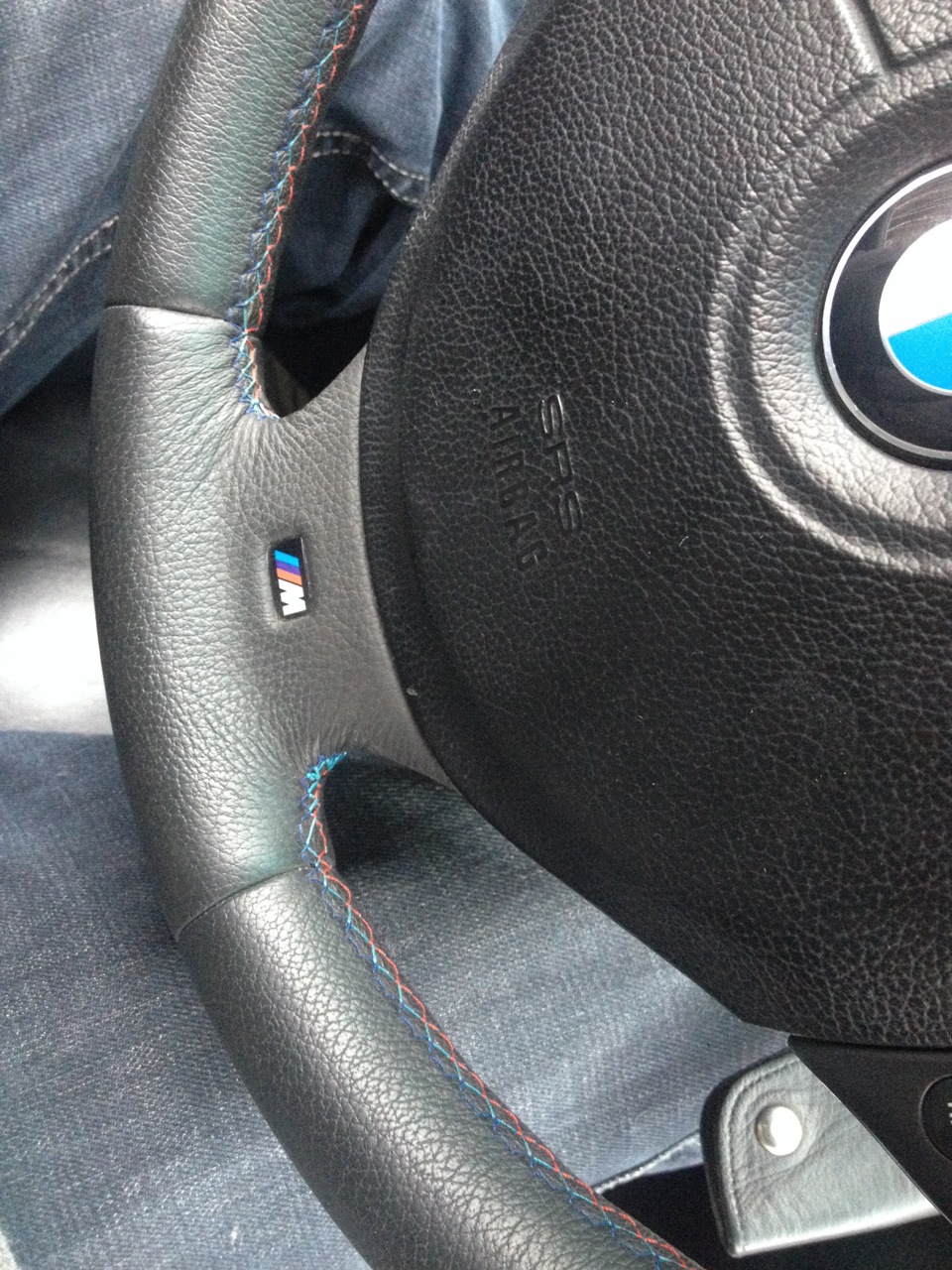 М руль сразу перетянули новой кожей, по качеству не уступающую оригинальной и прошили стежками в три М-цвета. Очень удобный, пухлый руль. Толщина обода получилась на порядок толще -как М рули в Е60.