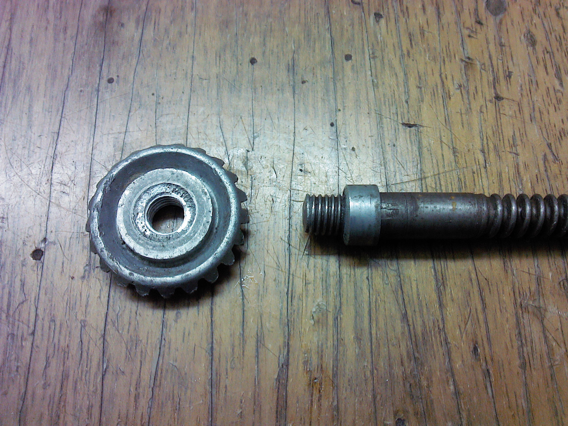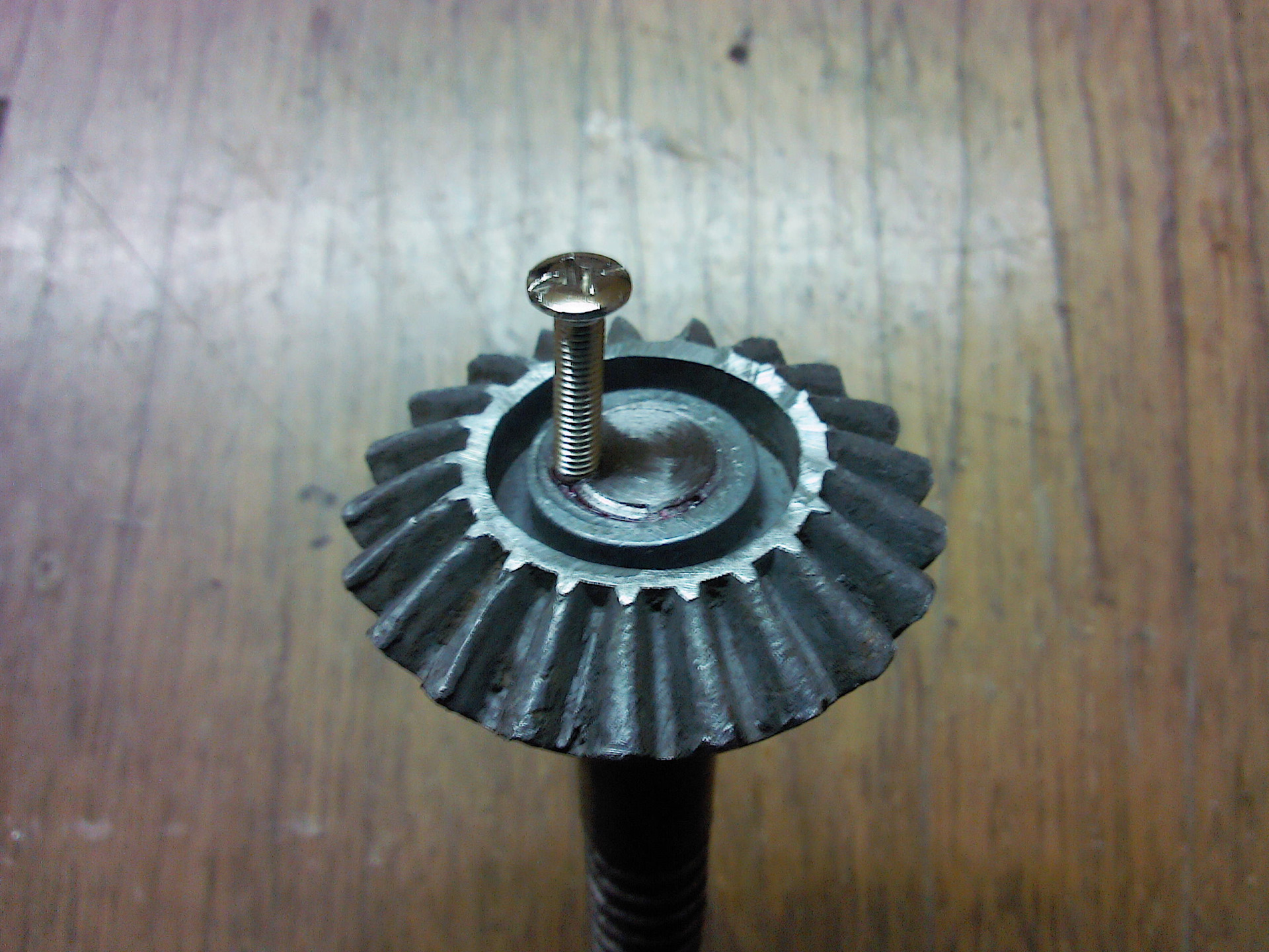 Потом сверлом сделал отверстие на границе резьб винта и шестерни и в это отверстие забил штифт, в моём случае болт.