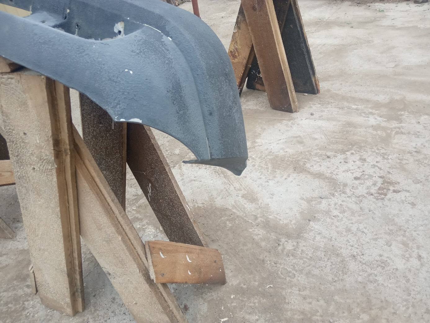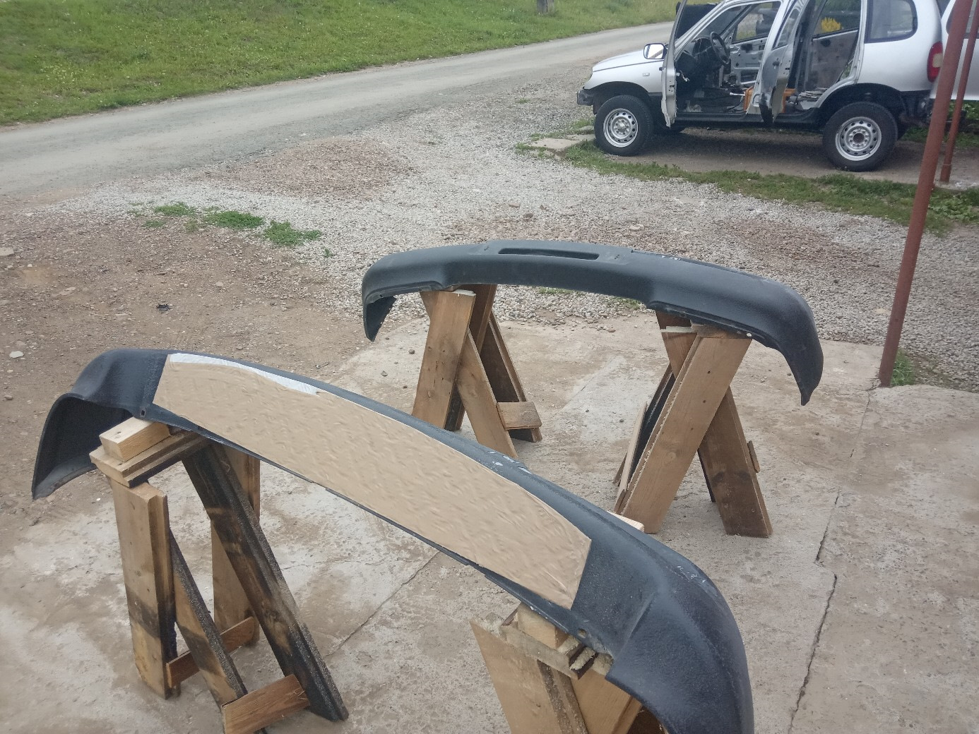 Далее выкрасил и приступил к бамперам. С переднего бампера срезал юбку и углы так как он постоянно все цеплял при падении в колею. Далее вместе с задним подготовил к покраске и выкрасил(раптор, краска, лак):