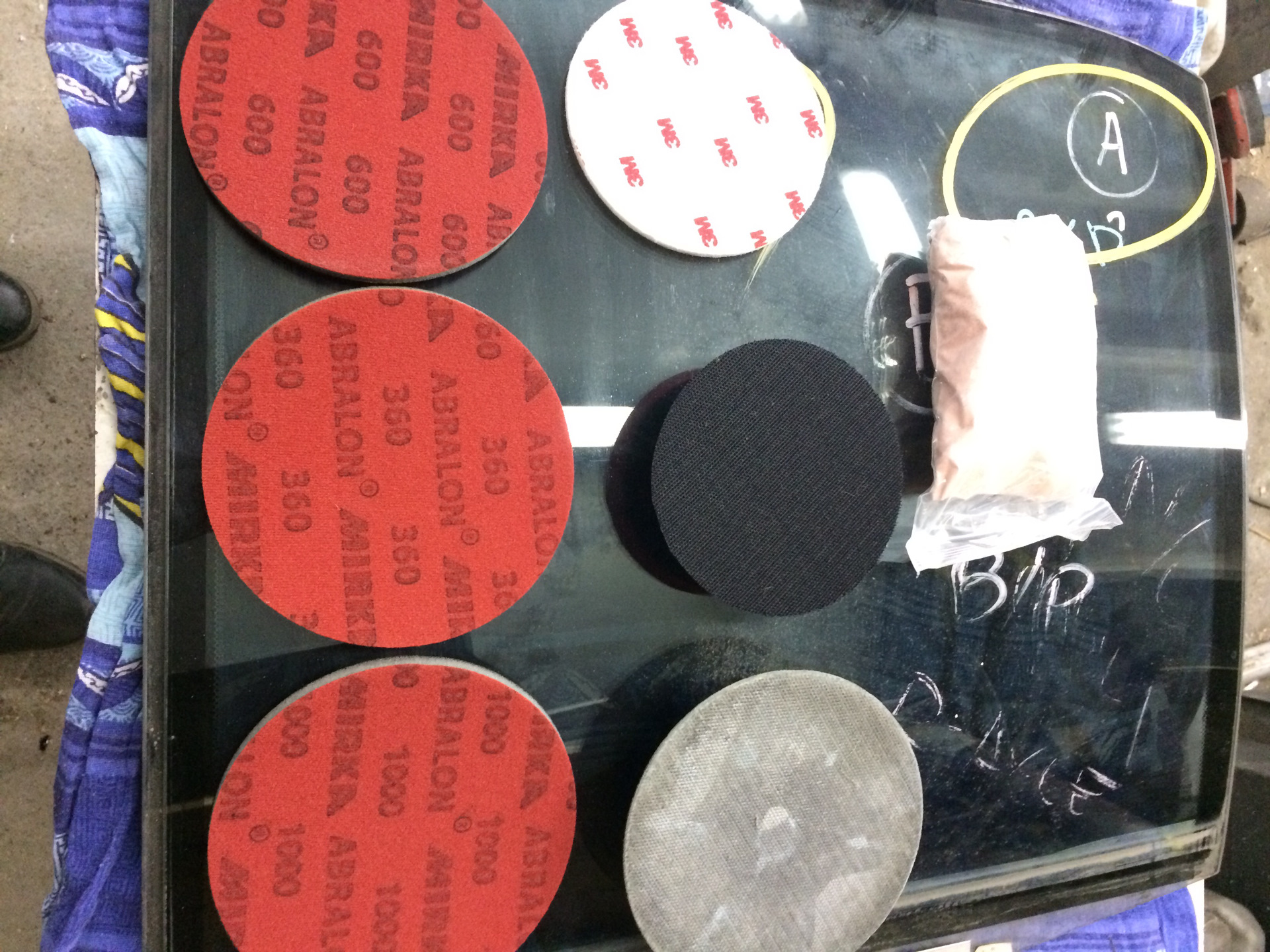 Для изгнания всей этой нечисти нам понадобиться вот такие ингредиенты: мирка абралон (360,600,1000), фетровый диск и платформа на 125мм, оксид Церия(на 4 боковых стекла около 100 грамм)
