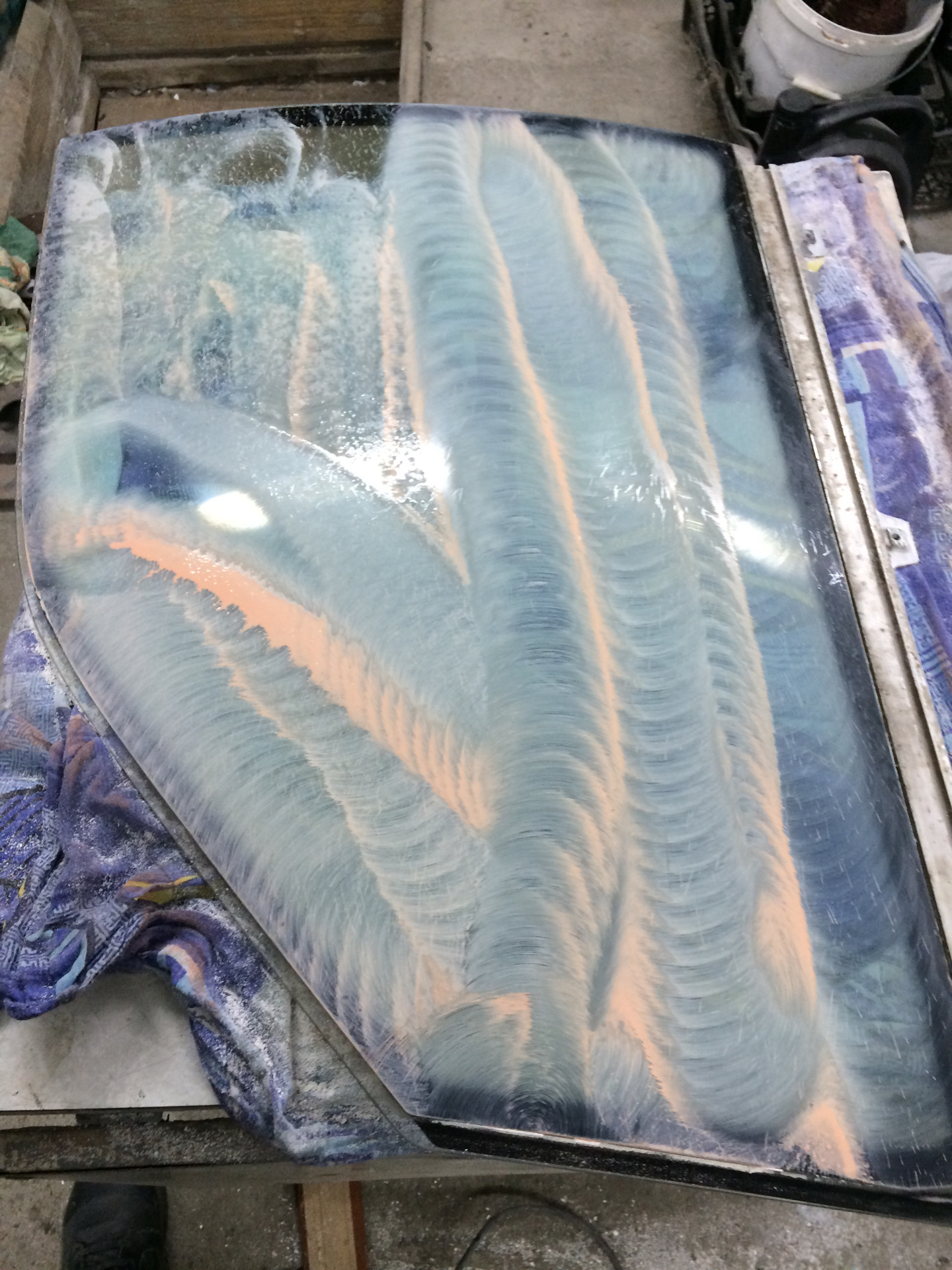 Далее на полировальной машине проходим от 360 до 1000 абралона, тут важно прошлифовать всю поверхность стекла, а вот если этим правилом пренебречь и сошкурить только царапины то вы получите эффект линзы и кривое стекло
