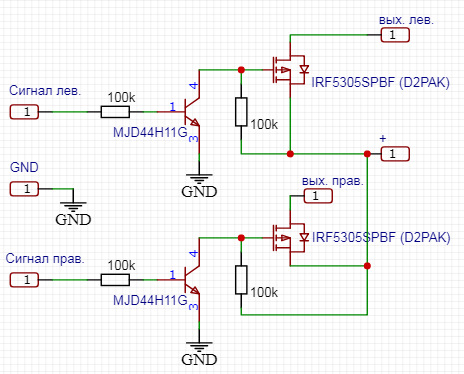 Моя реализация была такая из этих 2-х канальных плат сделать 4 канала, 1 на стоп, 2 на подворотники, 1 габариты.