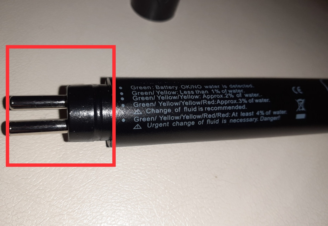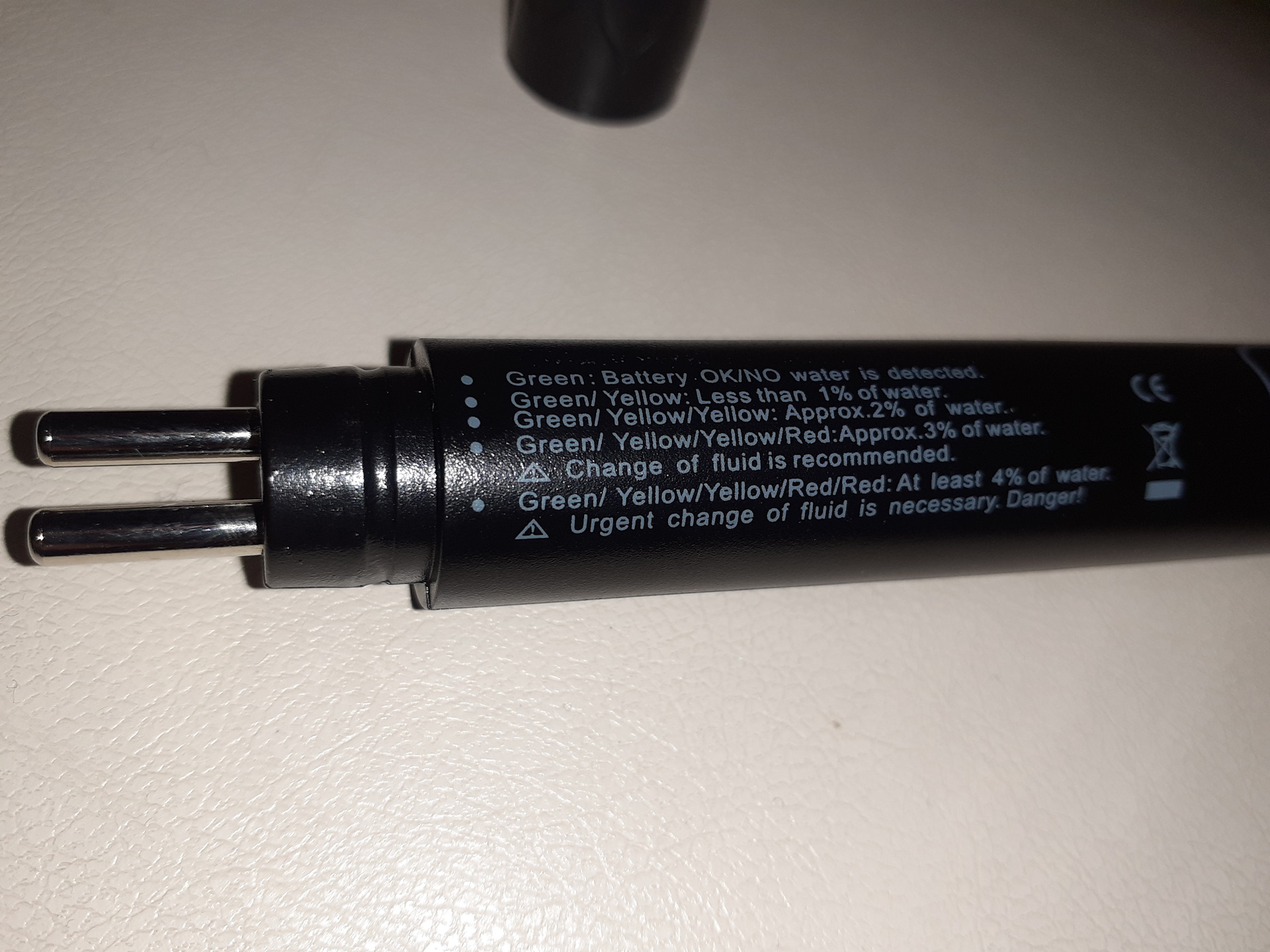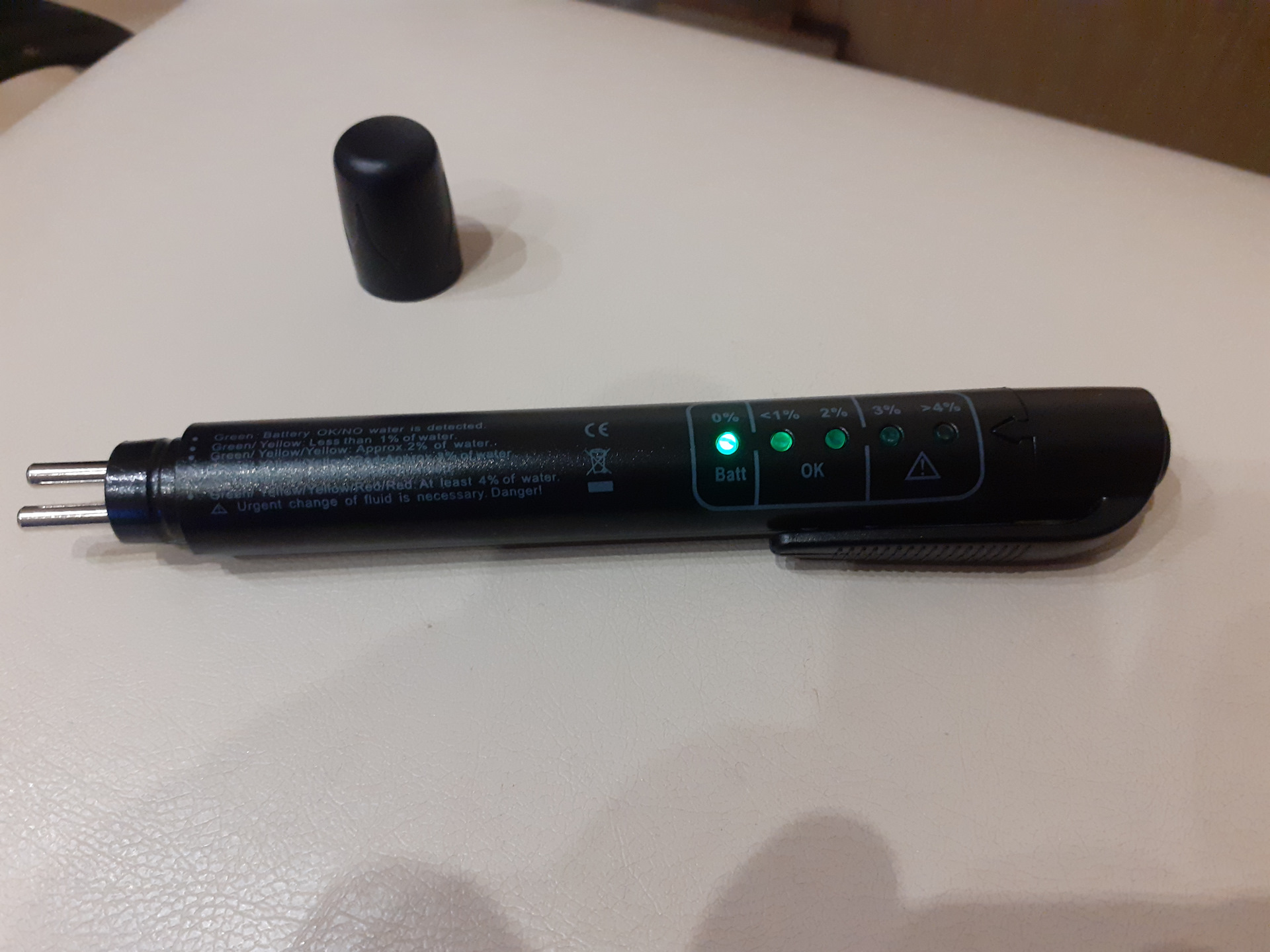 При погружении электродов в тормозную жидкость, если загораются только индикаторы 1 и 2 процента жёлтым — значит тормозная жидкость в порядке, а если 3 или 4 процента (они горят красным), значит тормозную жидкость следует немедленно заменить.