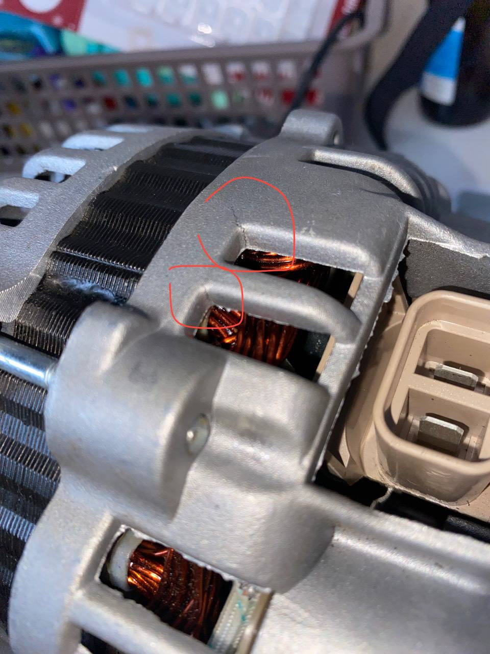 Генератор был демонтирован и разобран, оказалось, что пластиковая втулка под нижним подшипником генератора была без какого либо упора и буртика и как следствие она провернулась на подшипнике, провалилась к ротору и перепилила концы обмотки ротора, которые тоже не были защищены ни чем. Посадочное место заднего корпуса генератора тоже износилось. Пока мудохался с этим генератором, поставил еле живой оригинал, откатал неделю и начал мудохаться с обоими генераторами, в итоге собрал один из трёх, но так как ротор пришлось поставить от слабенького русского генератора, не много его не хватает при полной нагрузке на хх.