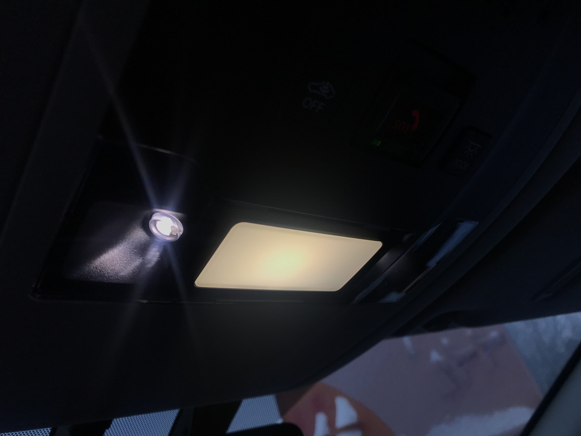 В Lexus блок освещения выполнен в техно стиле — диодные лампы из интересного процесс их включения сенсорный и очень удобно включить сразу все три источника просто проведя пальцем по потолку производит гипнотизирующий эффект на окружающих пассажиров)))