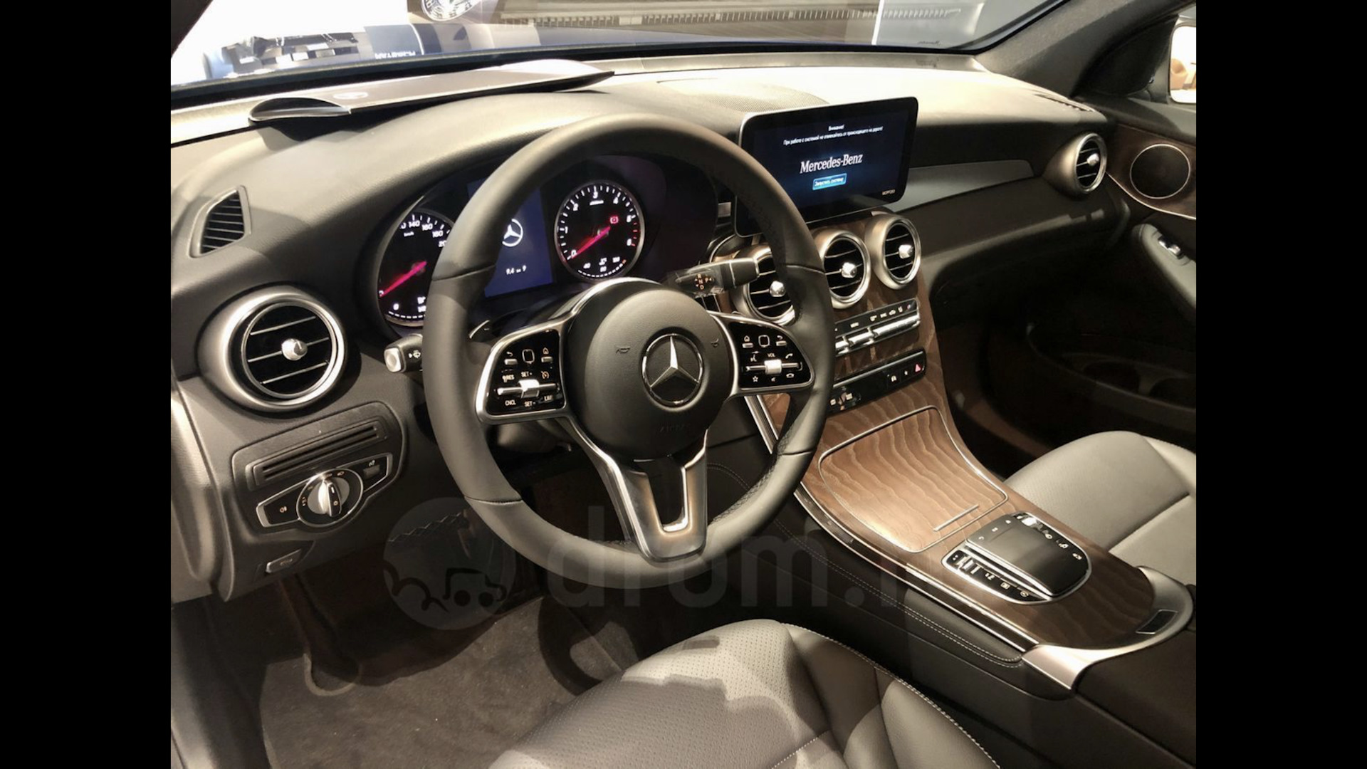 Реальные машины намного проще — вот Mercedes-Benz GLC за 3,7 млн.рублей. Приборка не цифровая, пакета сидений и памяти нет. Аудиосистема Burmister отсутсвует, поэтому сеточки динамиков чёрные. Руль намного проще. Всё смотрится намного проще…