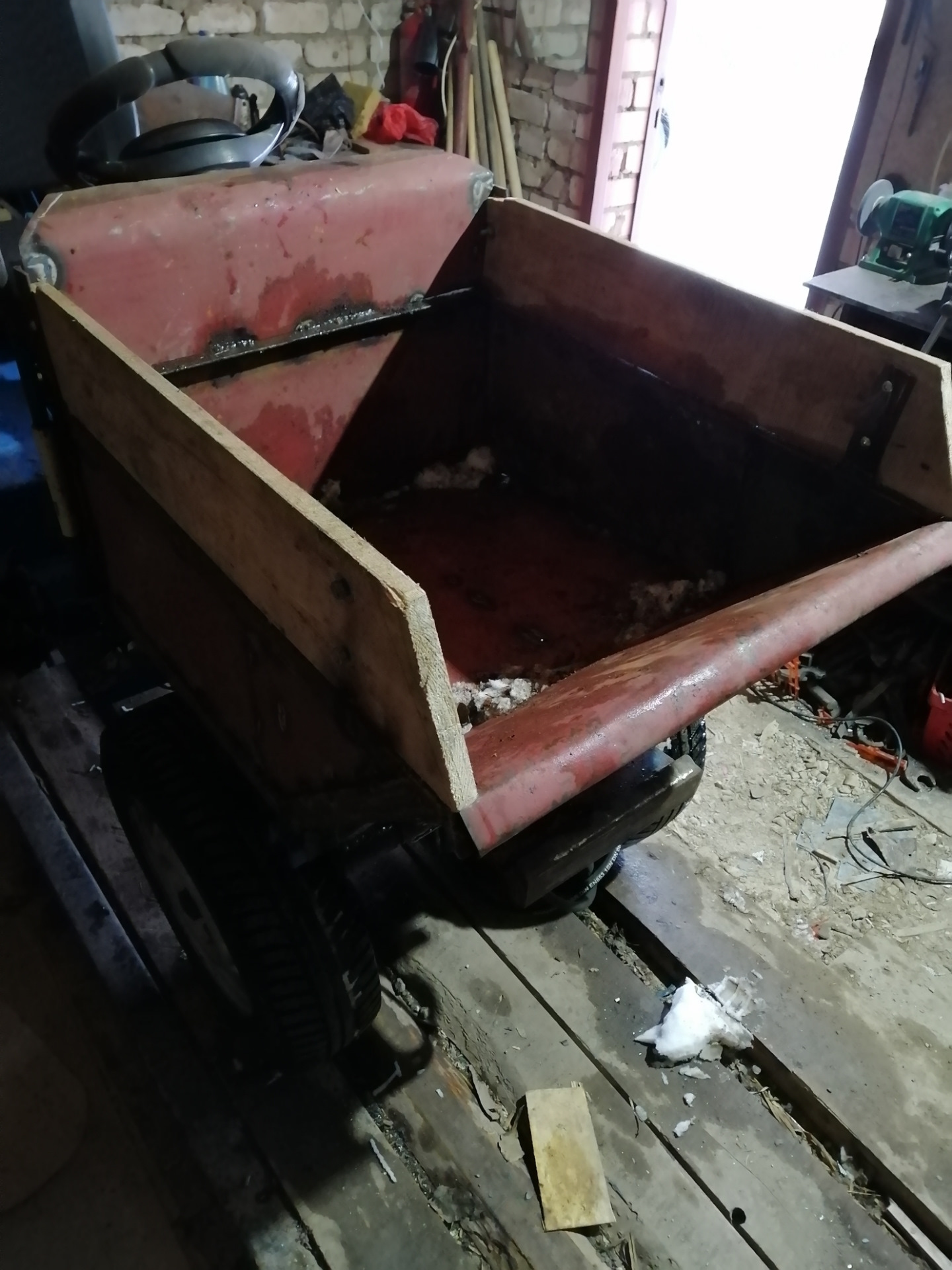 Доработка бортиков кузова, как на больших самосвалах. Так сказать с догрузкой на подтады😂😂 Общая грузоподъемность 200-210кг, если нагружать под один уровень с деревянными бортиками, с горкой вес самособой больше. Самосвал сбрасывает груз легко и так же с ним передвигается.