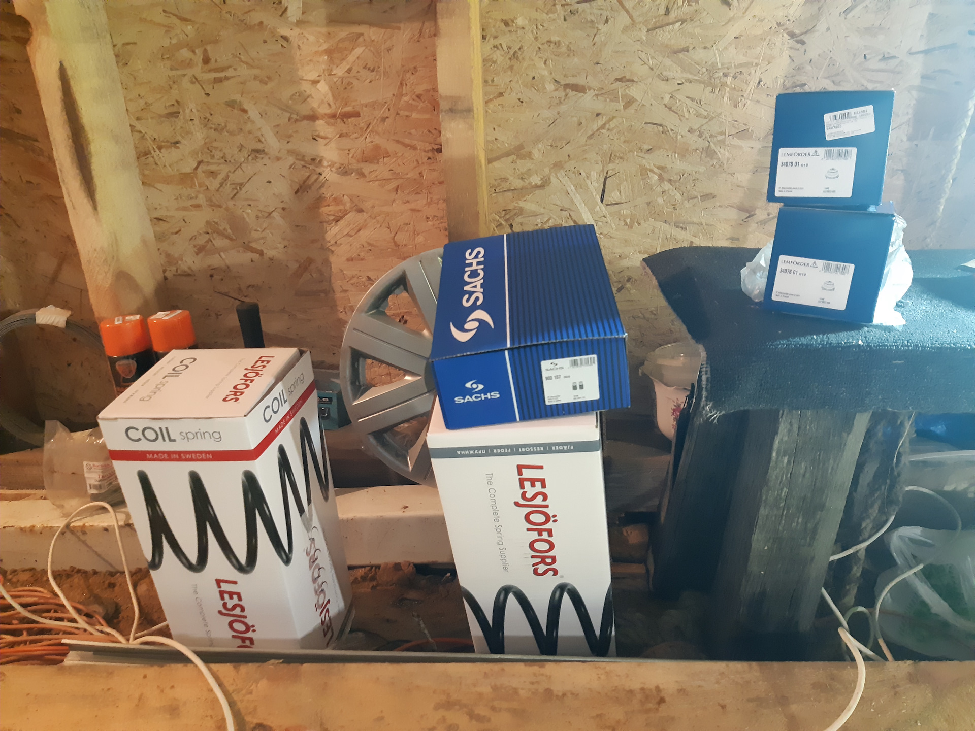 Я абсолютно против кроссоверов, считаю их бесполезным авто, очень люблю свою s40. Поэтому купил пружины lesjofors 4095834 от дизеля, пыльники, отбойники и опоры с подшипниками. Вся замена заняла в новом незаконченном гараже 7 часов с обедом.