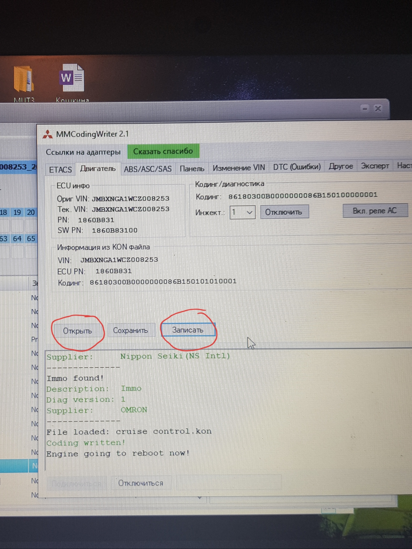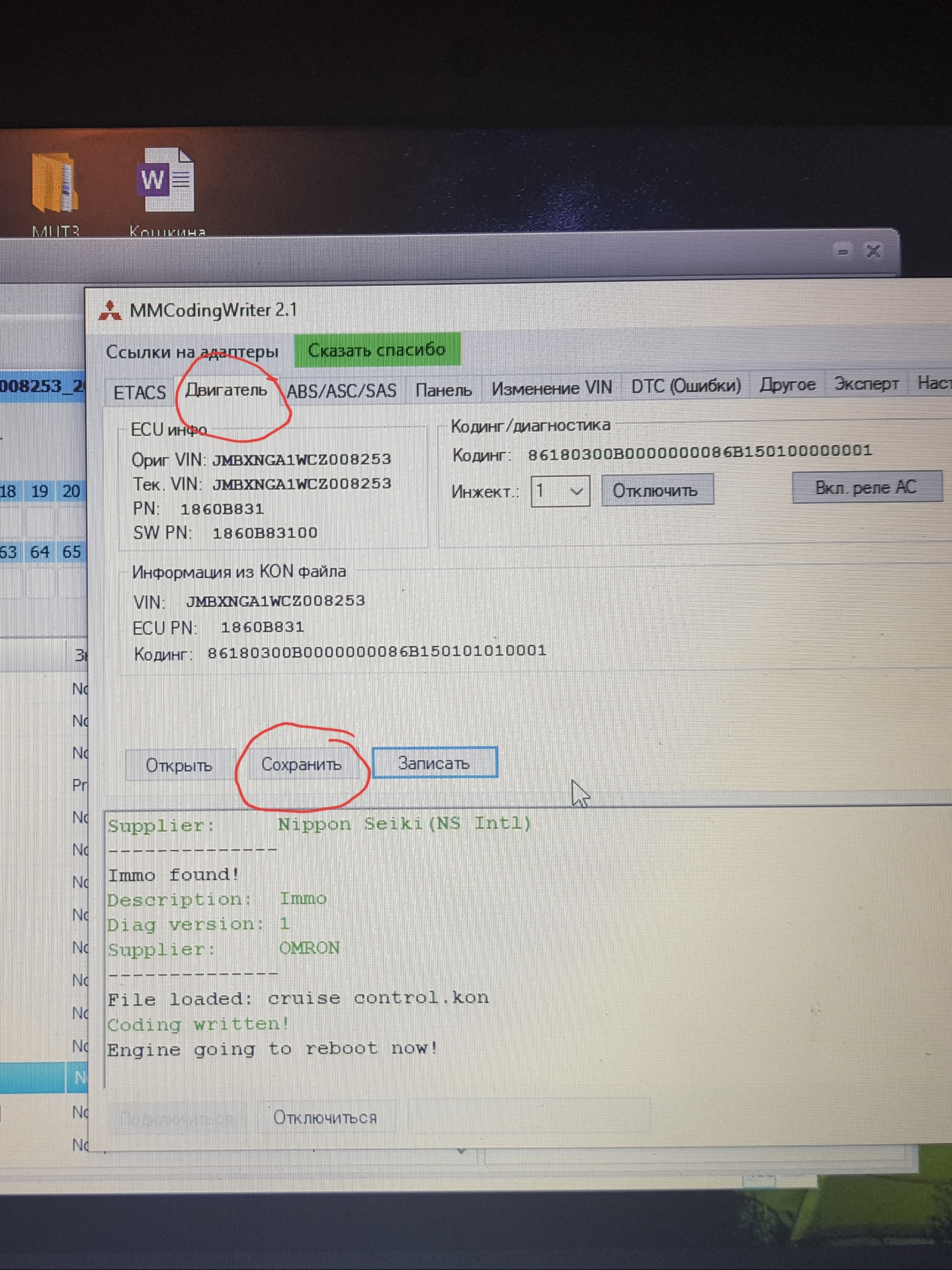 Итак, подготовительная часть закончена, переходим к авто. Садимся, подключаемся к тачке через ELM, включаем обе программы. Сначала нужна ММС. Там во вкладке Настройки выбираем тип подключения ELM, все настройки авто и нажимаем подключиться. Внизу вылезет зелененьким результат, что все подключено и найдено. Далее, переходим во вкладку Двигатель, сохраняем и исходный код.