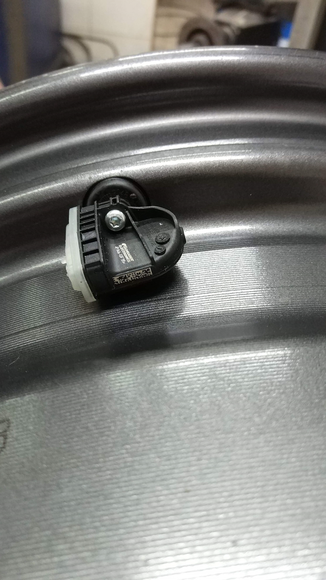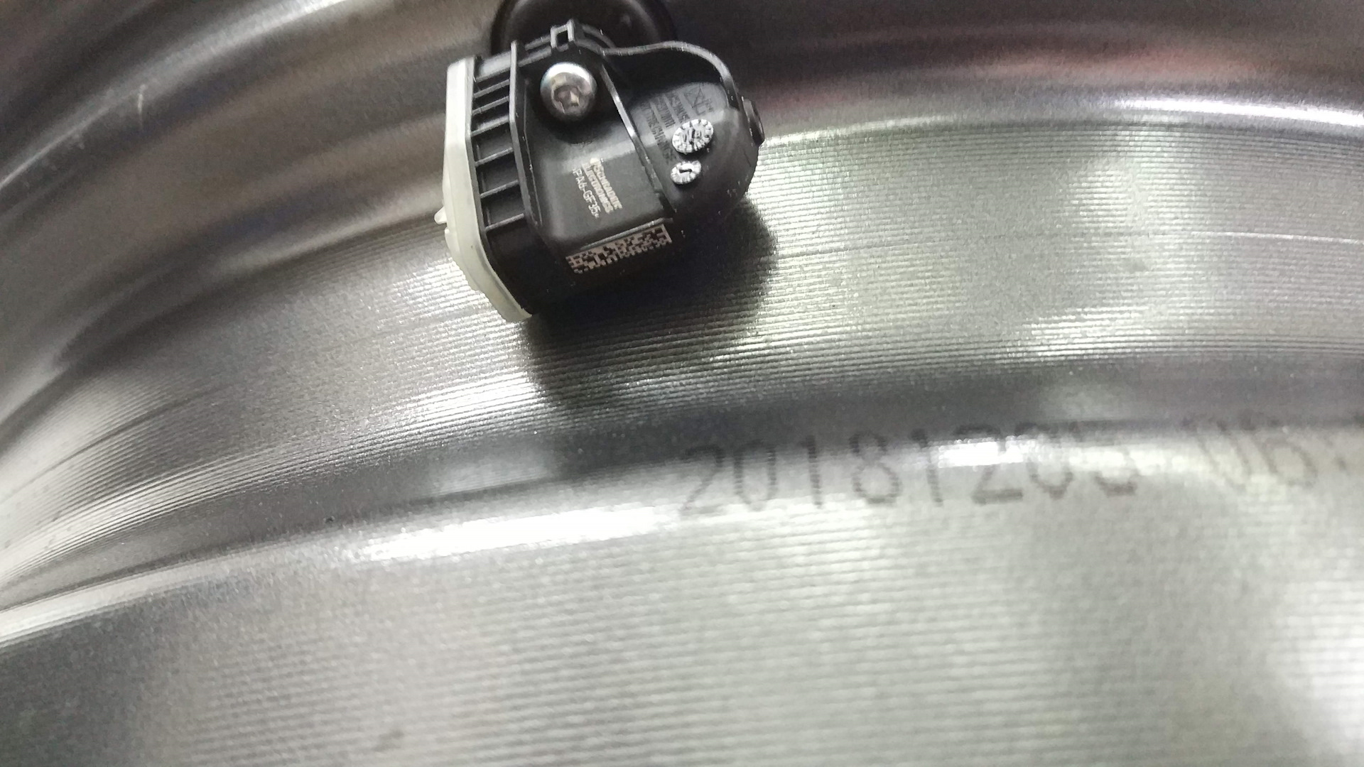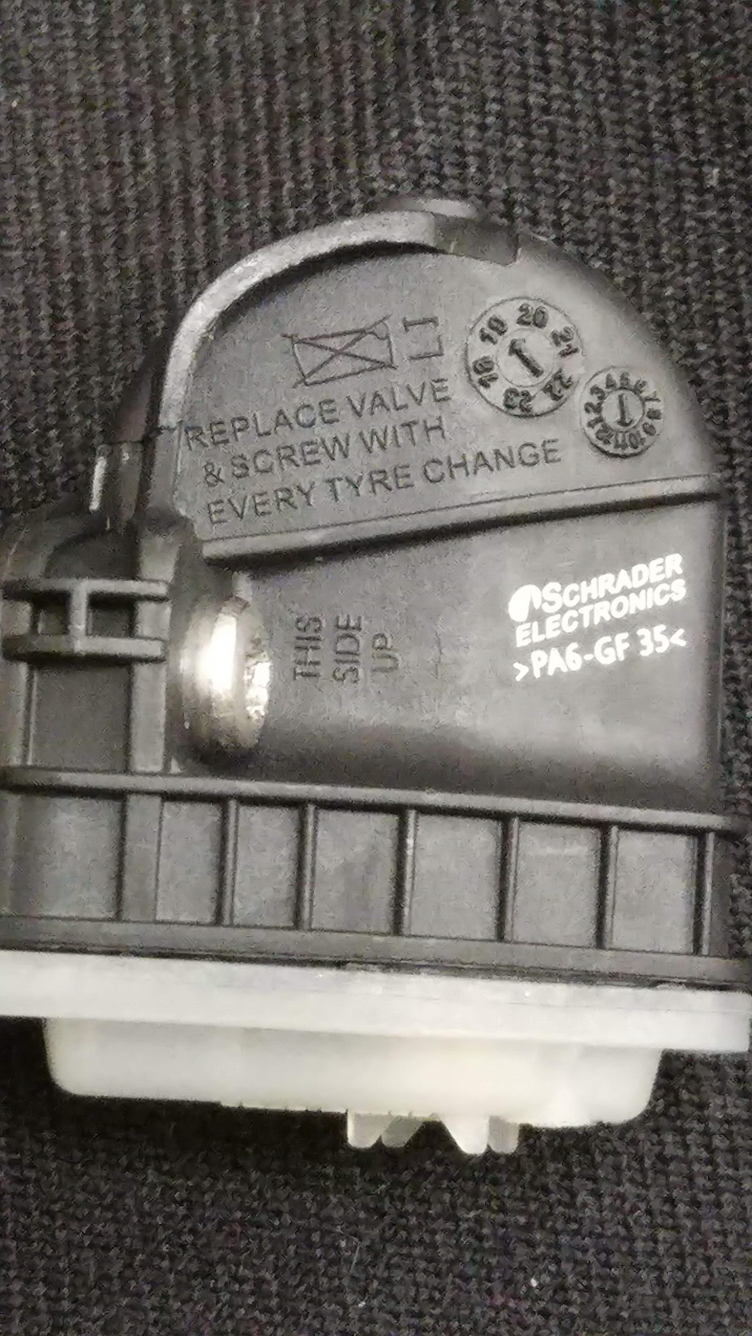 Пока в субботу переобувался, сфотографировал на двух разных колёсах датчики давления:
