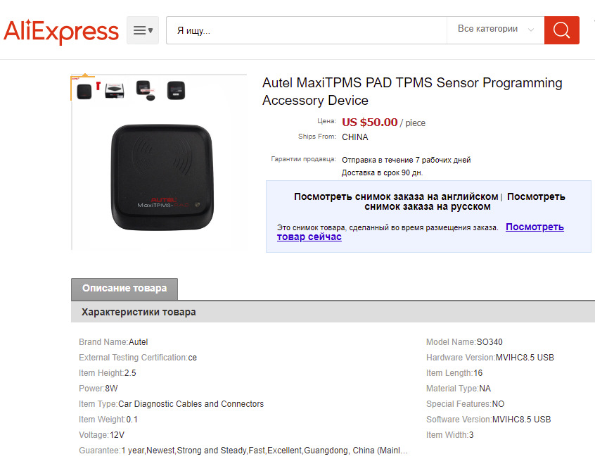 Истомлённый всяческими мыслями, решил что хватит тянуть резину, и заказал TPMS Pad, правда не в оригинальном магазине Autel с доставкой из России за 10 дней при стоимости в $66, а в другом магазине на Aliexpress с доставкой из Китая за месяц, но ценой в $50.