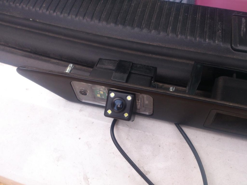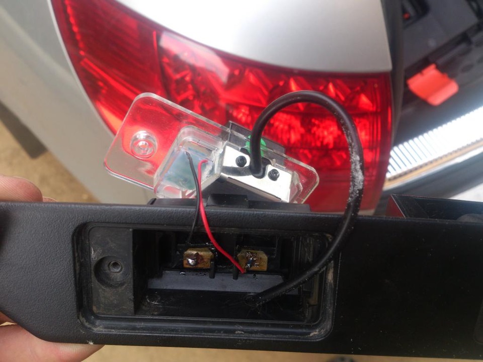 Вместе с магнитолой заказывал камеру в подсветку номера и радио передатчик с приемником, чтобы провод не тянуть. Так вот, оказалось, что магнитола не переключается на видеовход с камеры. Не знаю конкретной причины, но мне кажется, что дело в МКПП. В магнитолу сигнал ЗХ поступает (как и ACC) из блока дешифровки CAN шины, который идет с магнитолой. Так вот у меня из этого блока ACC приходит, а 12в при включении задней передачи нет. Полагаю, что у автоматчиков этот сигнал гуляет по CAN шине, а у МКППшников тупо концевик в коробке идет на задние фонари. Схему не нашел, поэтому решил тянуть провод взад. Начал, естественно, с самой камеры. Раскурочив обшивку багажника и сломав рамку номера из-за закисшего болта и провернувшейся из-за этого гайки, выкрутил планку с ручкой багажника и фонарями подсветки. Чтобы не кромсать лишний раз родную проводку и не курочить разъемы, припаял диоды подсветки прямо к контактам старого фонарика, а хвост камеры вывел через просверленное отверстие: