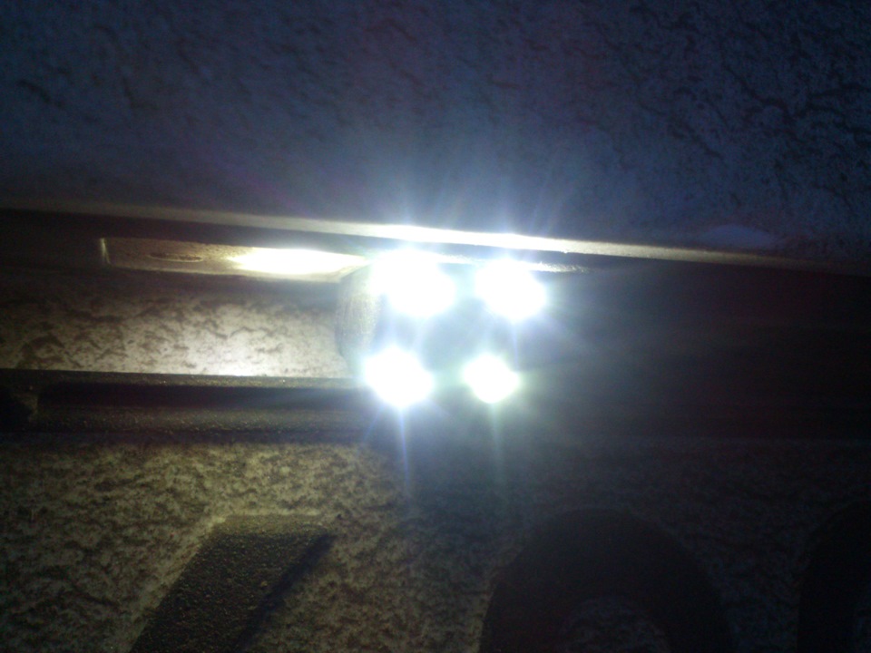 Но есть ещё она неприятность эстетического свойства. Камера идет с диодами для подсветки номера, поэтому второй плафон я тоже поменял на светодиодный с резистивной обманкой. А он мало того, что помигивает и иногда ошибку выдает, так ещё и цветом другим немного светит. Вот теперь ищу еще диоды, буду по цвету подбирать. А если не найду, разберу камеру и сам впаяю, тогда точно одинаково будет:)