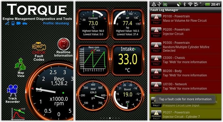 Список возможностей этого программного продукта очень большой. Кроме базовых возможностей (отображение параметров автомобиля в реальном времени, полная диагностика автомобиля), можно использовать GPS-трекер, который предоставит журнал параметров двигателя, который позволит видеть, что Вы делали в любой момент времени. Стоит отметить и удобный интерфейс с возможностью выноса на главный экран показателей всевозможных датчиков.