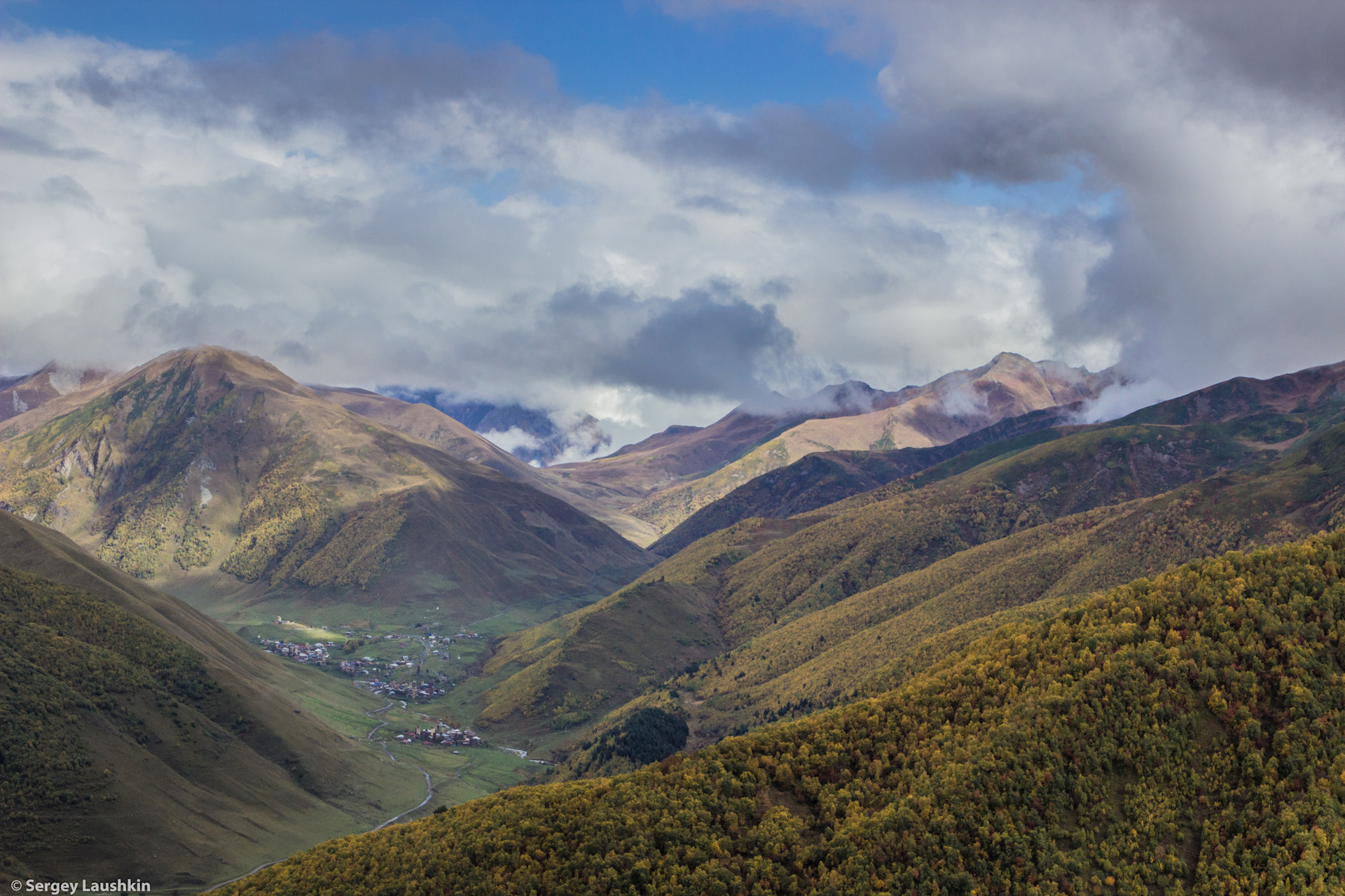 Наши надежды о том чтобы увидеть с вершины перевала Главный Кавказский хребет, а самое главное гору Шхара не сбылись. Хоть мы и выше облаков, но гор не видно. Только село Ушгули виднеется в долине у реки.