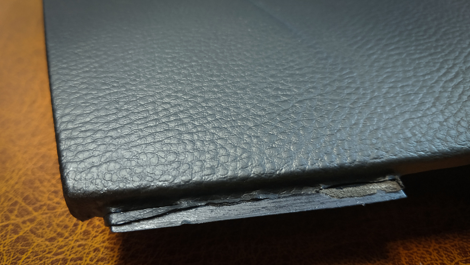 Со мною редко такое бывает, но факт имеет место быть… Процесс я не сфотал, поэтому просто на словах… Шкуркой 100 зачистил поверхность крышки — интересный материал, зеленая пыль и очень маркая. Напильником чуть прошелся по контуру — чуть компенсировал прирост толщины за счет кожи. Обезжирил все разбавителем "молекула" — ядреная штука и улетучивается быстрее ацетона, также растворяет крышку и приобретает зеленый цвет, сильно пачкая руки. Но! Без обезжиривания — клеится плохо! Пробовал днем раньше маленький кусок приклеить. Нанес клей (разбавлял 1:1, сохнет моментально — это очень неудобно) на обе поверхности кистью и оставил на час. А далее нагревая феном, постепенно от края к краю… грел, прижимал, давал остыть, итд… Все совсем не сложно! Результат на фото: