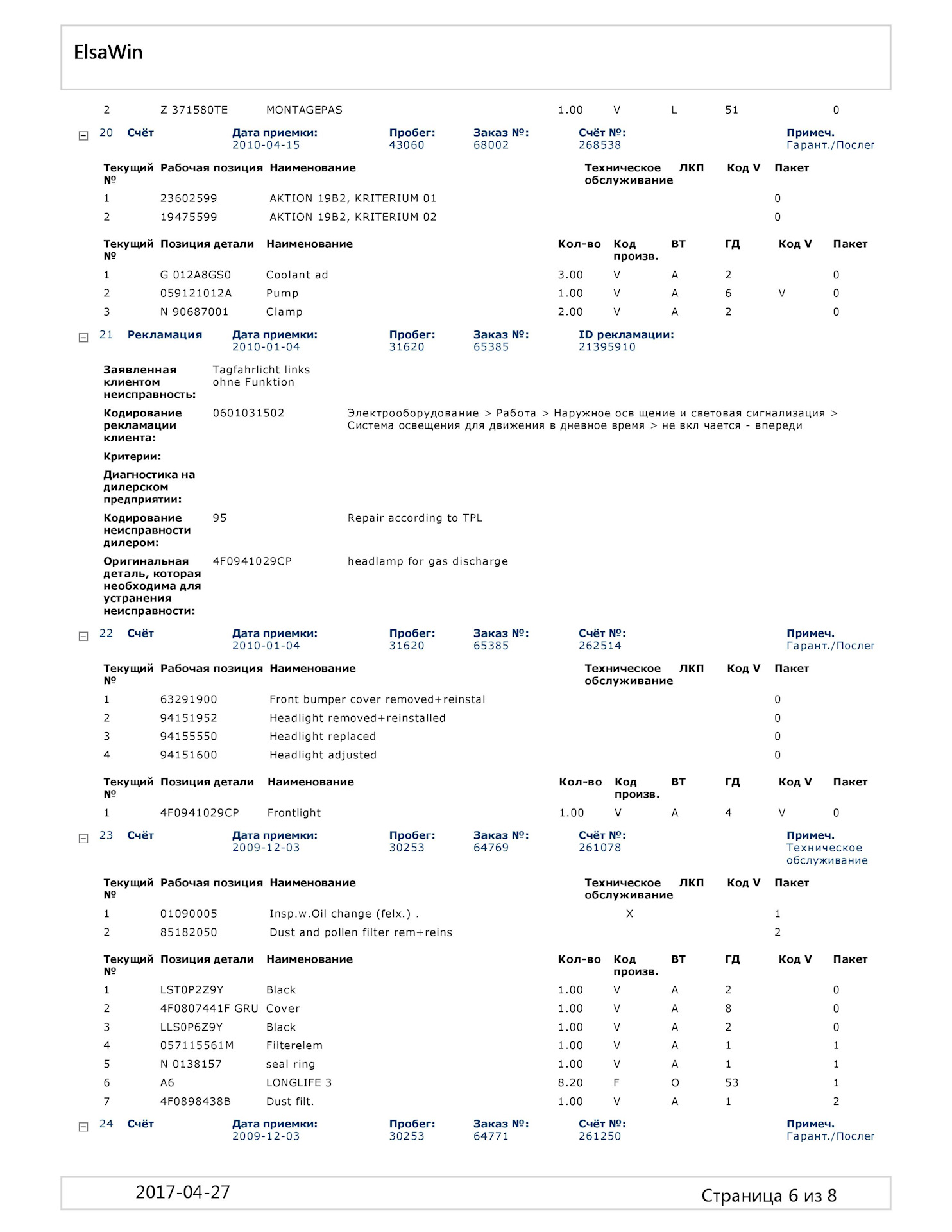 — Меняли передние фары (С фарам били проблеми всем автомобилям A6 C6 рестаил до 19.06.2009)