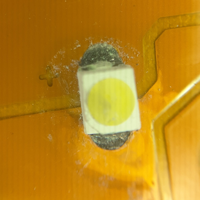 Полностью разобрав фару чтобы добраться до светодиодов, сначала опешил, потому что никогда не видал диодов с такой шляпой, но потом выяснил что линзы можно снять и под ними обнаружатся обыкновенные светодиоды SMD типоразмера 3528. Диоды на ленте соединены в группы по три штуки. Одна из этих групп у меня и выгорела.