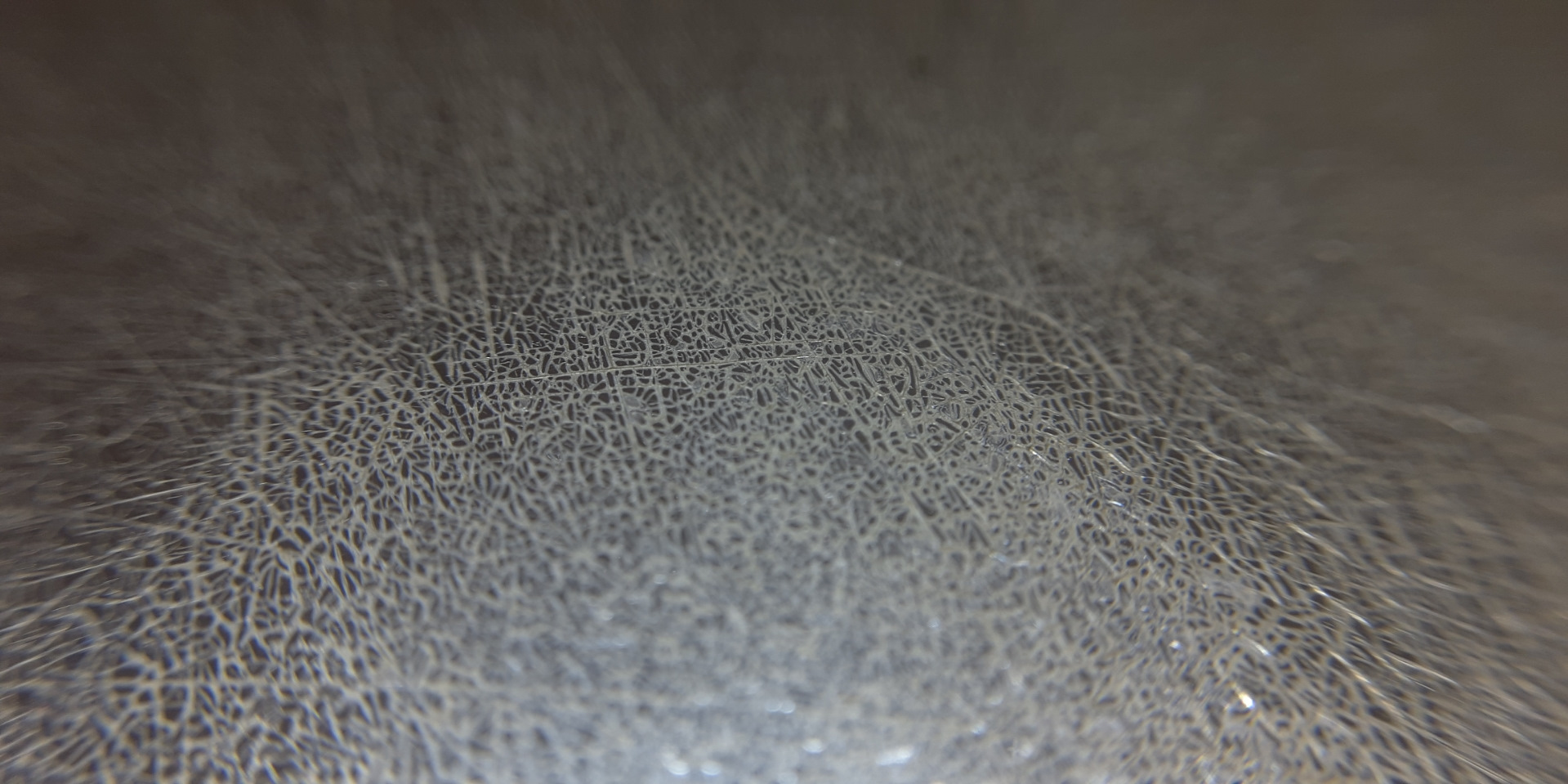 Сначала подумал про полировку, но рассмотрев поближе понял что полировка бы ничего не дала, так как проблема не в царапинах. Стекло деградировало — сильно потрескалось в мелкую трещину ровно в тех местах, где на него падает луч от ламп.