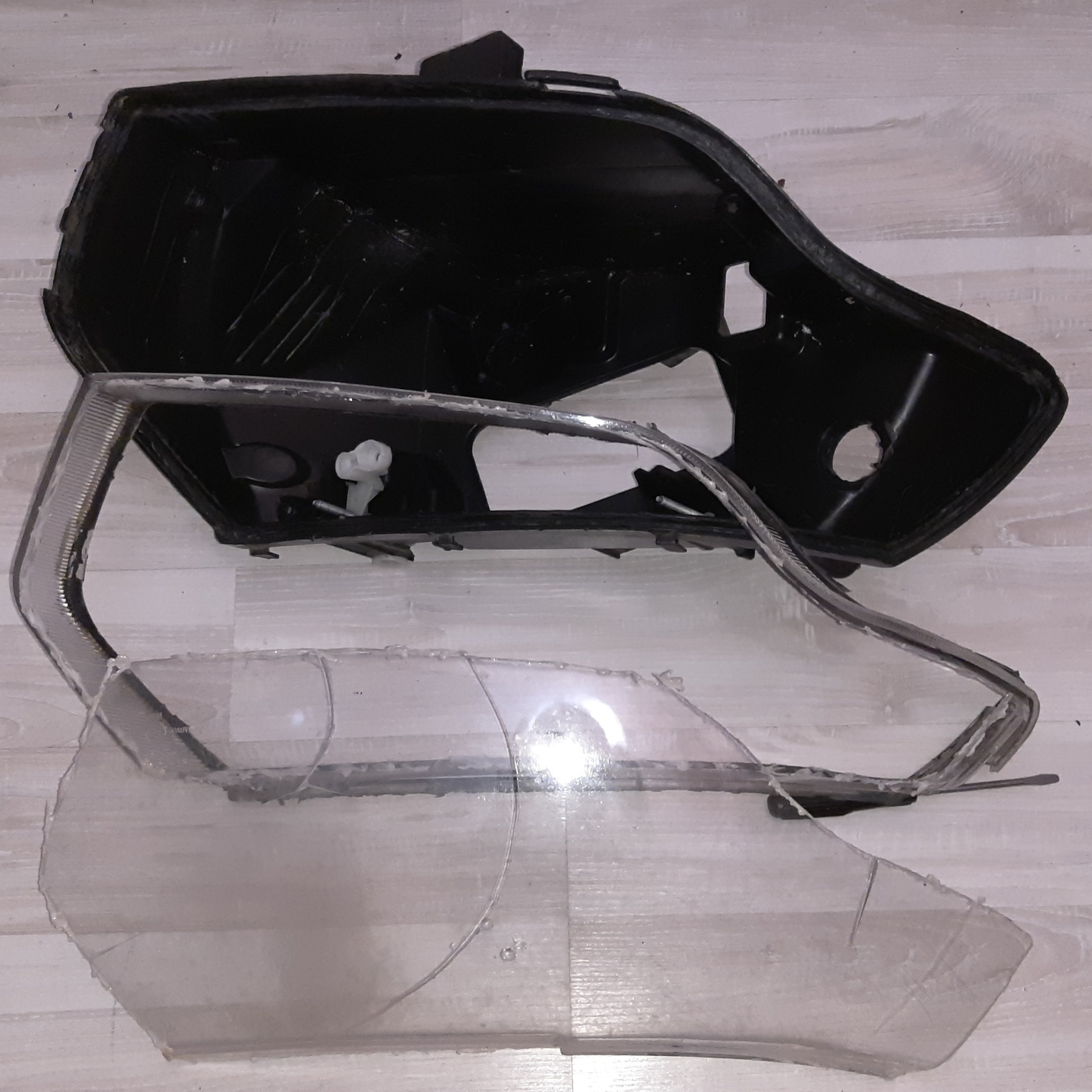 Начитавшись в сети и попробовав отделить стекло от фары с помощью нагревания клея фары по периметру строительным феном, почти сразу бросил — это бесполезное занятие. Дело в том, что клей находится не только снаружи, но и внутри фары (его там даже несколько больше). Чтобы его прогреть надо настолько долго и сильно работать феном, что пластик корпуса фары может начать деформироваться. Хотя может лайфхак с прогреванием фары в горячей духовке сработал бы, но у меня такого прибора на кухне нет.