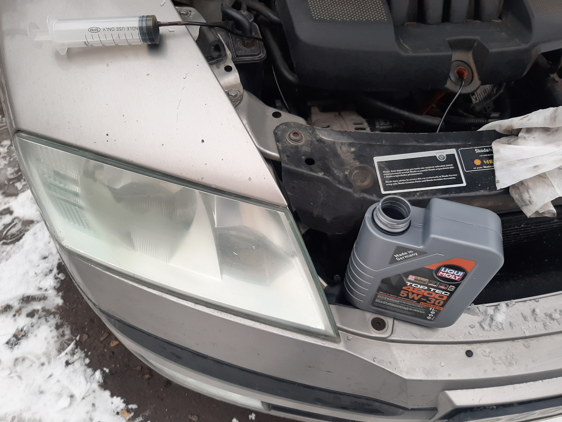 С испугу залил сразу около 800 грамм. Думаю лишним не будет. Завел, вроде ничего. Как начала прогреваться, стало появляться небольшое троение. Немного проехался и обратил внимание, что упала динамика и повысился расход топлива. Решил проверить уровень масла на щупе и понял, что перелил, так как уровень был на порядок выше максимума. Для отсоса лишнего масла решил сделать нехитрое приспособление: приобрел в аптеке капельницу и 5-ти кубовый шприц (если брать больше, то носик шприца не налезет на шланг капельницы). Вытащил щуп, после чего в его вставил в его отверстие штанг капельницы. Причем данные манипуляции провести было очень сложно, потому что отверстие довольно узкое, пришлось повертеться минут 10. Второй конец капельницы натянул на носик шприца.