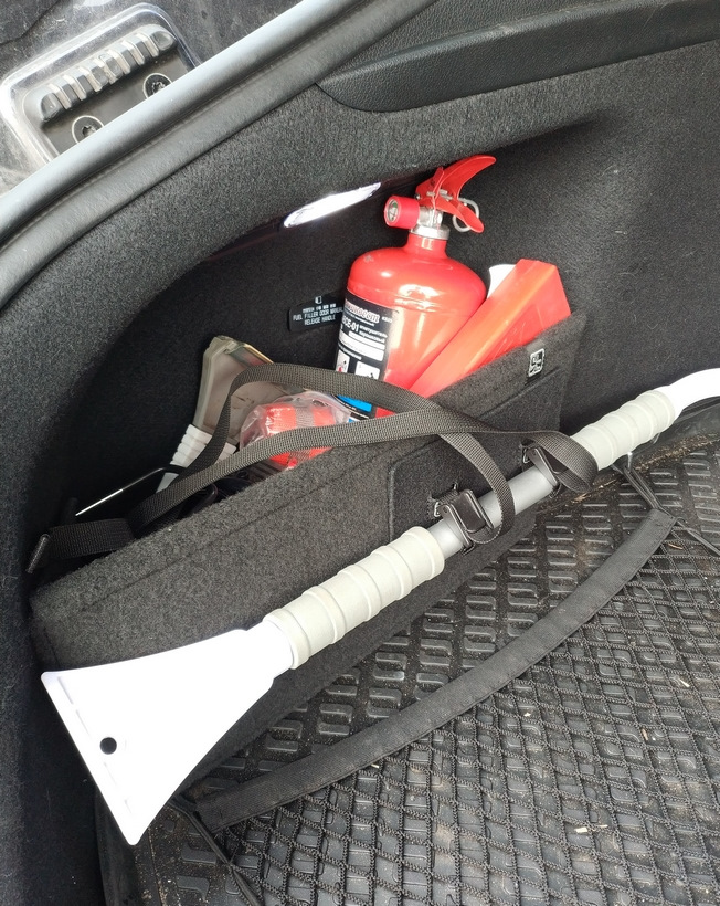На входе: огнетушитель, аварийный треугольник, буксировочный трос, аптечка, скребок, швабра, компрессор, набор отвёрток, 4 литра омывайки, 0.5 воды, большая сумка для Лент-Ашанов.