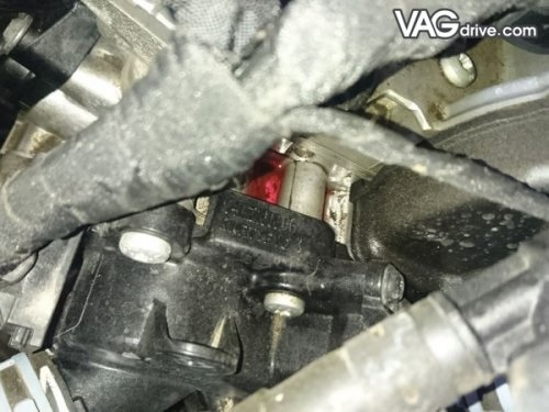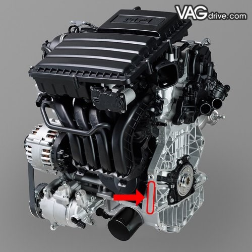 Номер двигателя CWVA, CWVB расположен на площадке на стыке блока цилиндров и КПП: