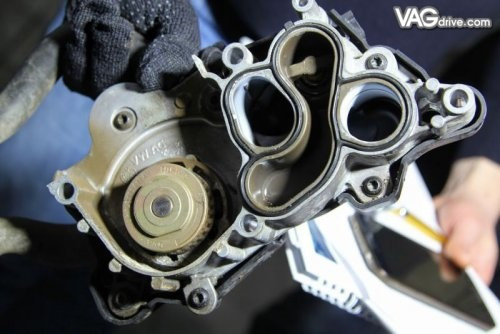 Эта помпа на моторе CWVA приводится в действие собственным ремешком, который работает без натяжителя и роликов. Соответственно у данного элемента меньше деформации при нагрузке, что радует. Но плохо лишь, что она моноблочная и отдельно в ней ничего не заменишь.