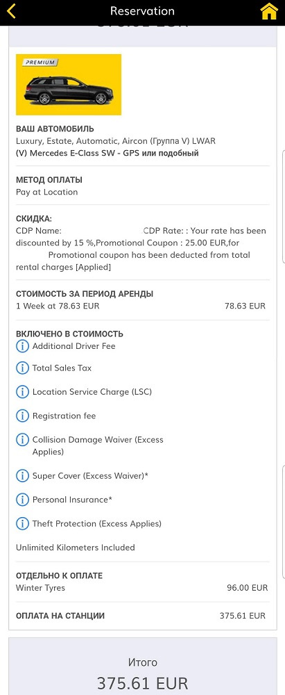 К слову сказать, без скидочных кодов у Hertz напрямую этот же автомобиль обошелся бы в 27407 рублей, правда с зимней резиной. С суперстраховкой без скидочных кодов сумма выросла бы уже до запредельных 49365 рублей у Hertz напрямую…