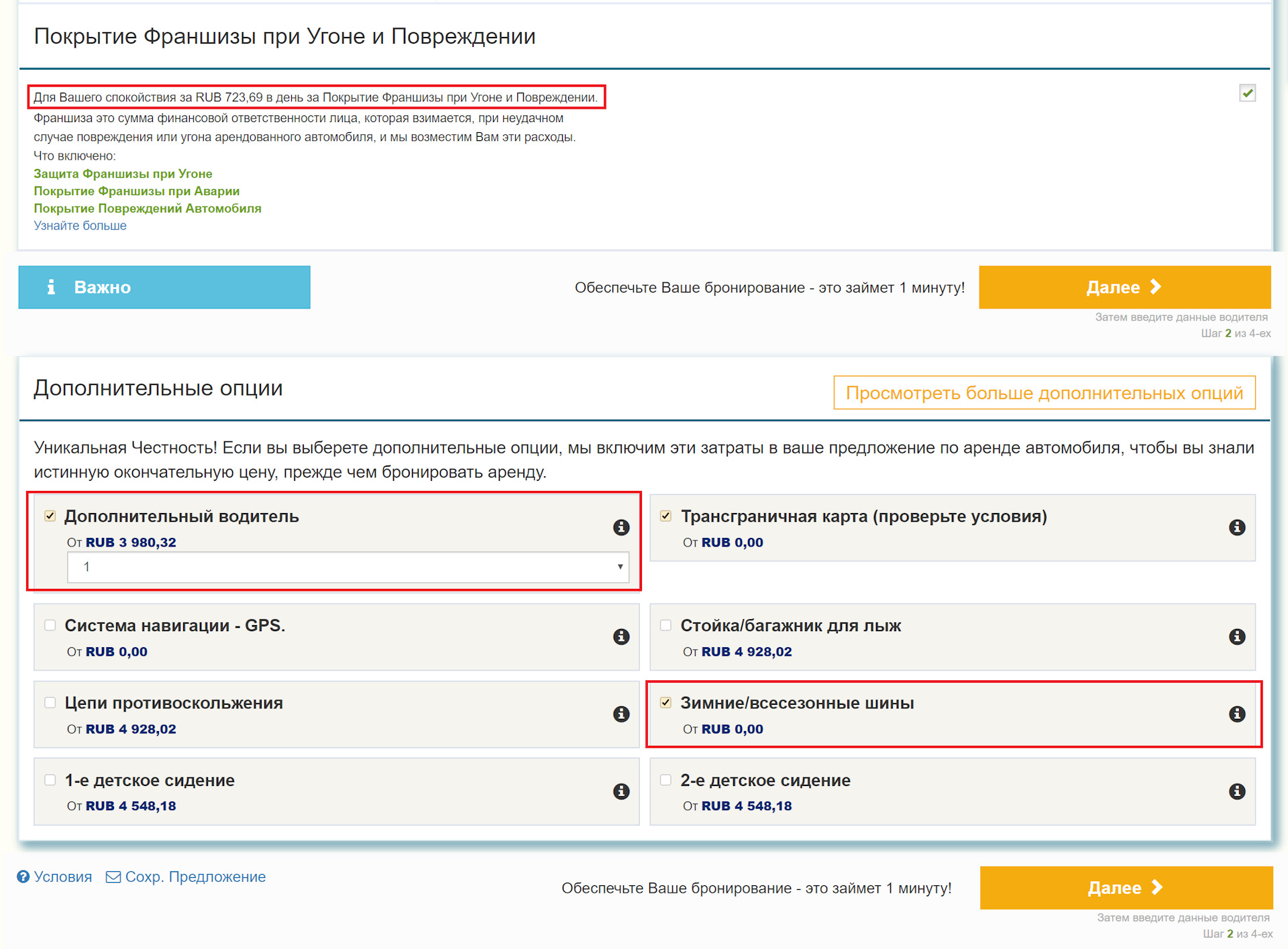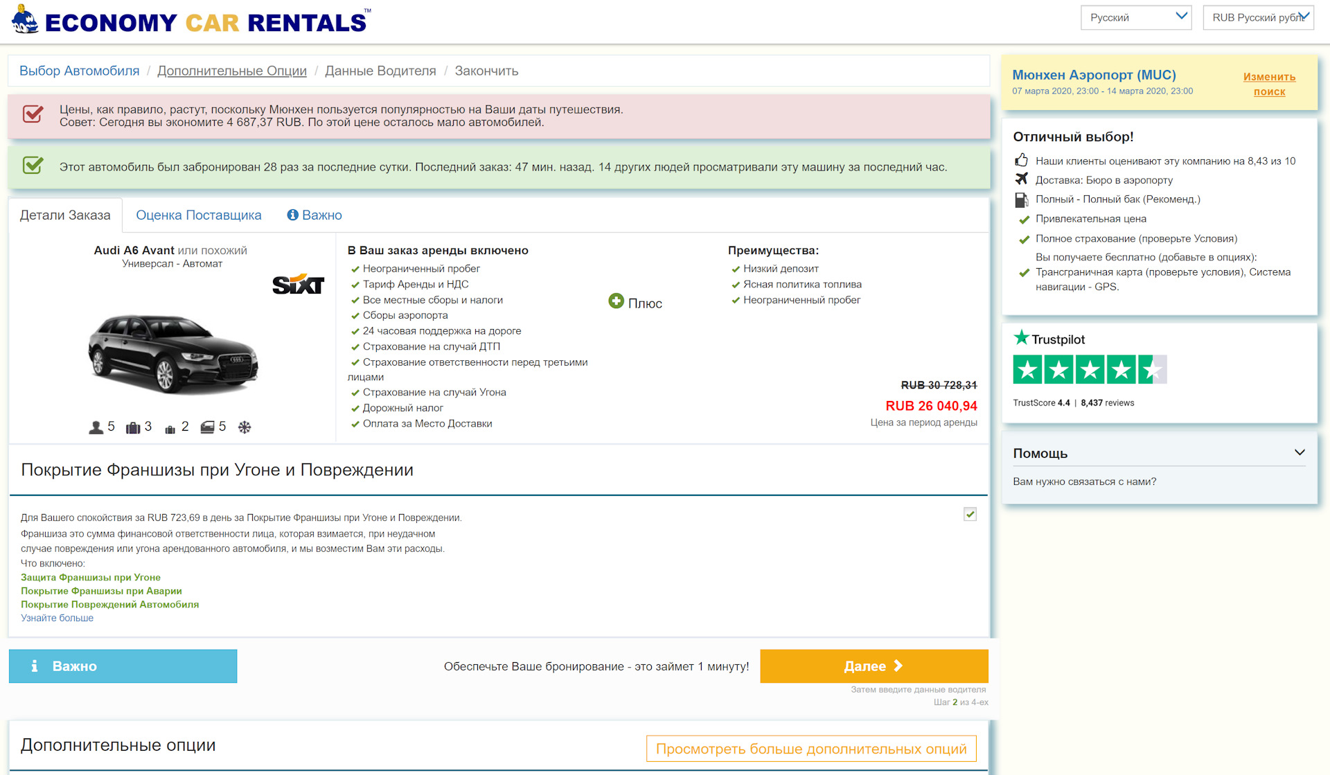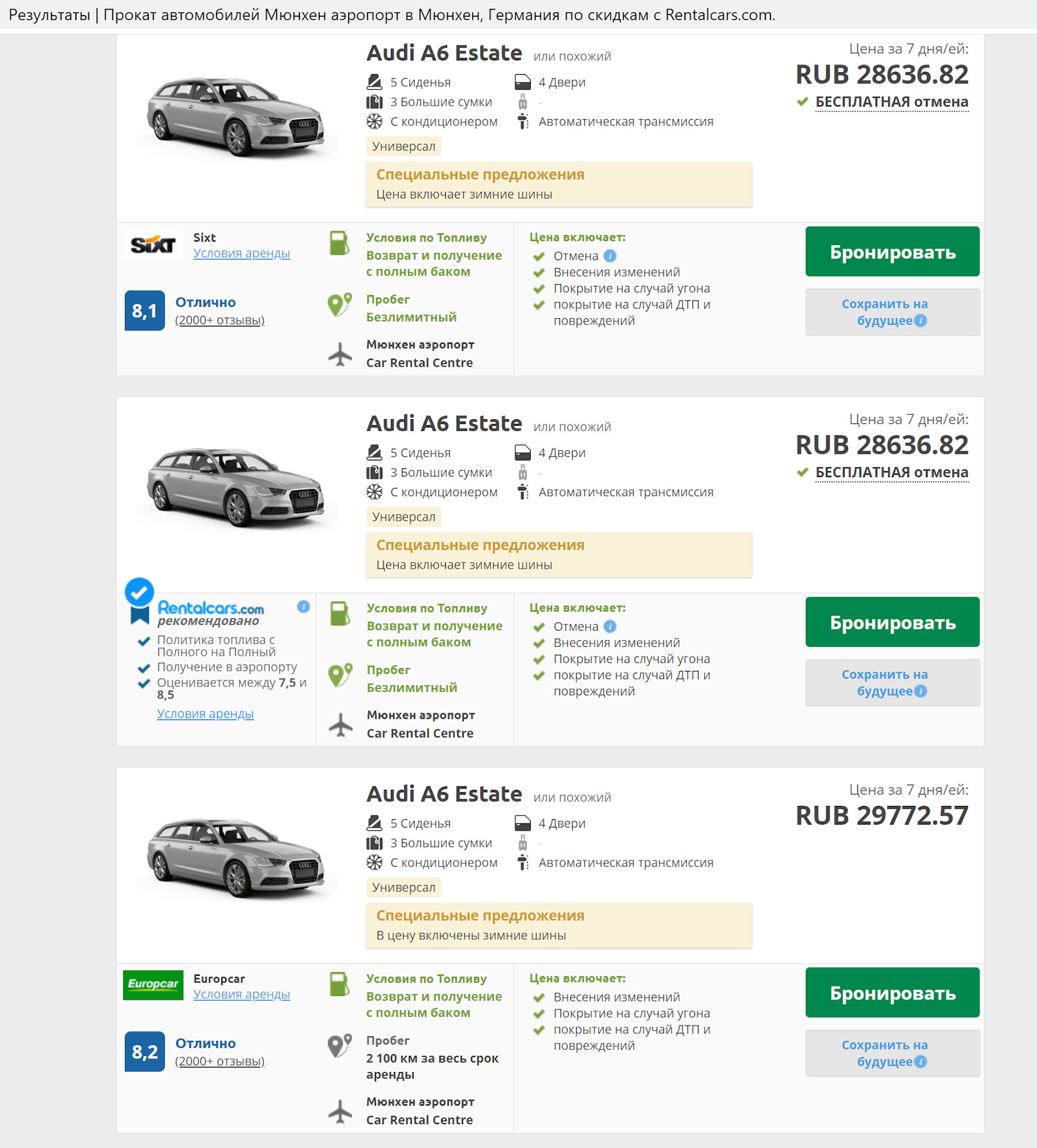 Через Rentalcars сравнимый универсал Audi A6 у Sixt вышел бы в 28637 р. + 8062 р. за доп.страховку франшизы и еще 52.5 евро (3606 р.) за дополнительного водителя! Итого — 40305 р.