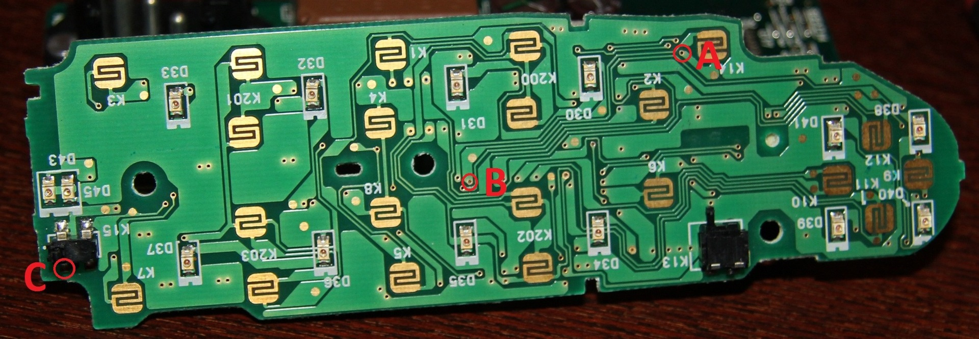 Это места пайки рекомендованные не мною. А и В — места перехода дорожек кнопки на изнаночную сторону.
