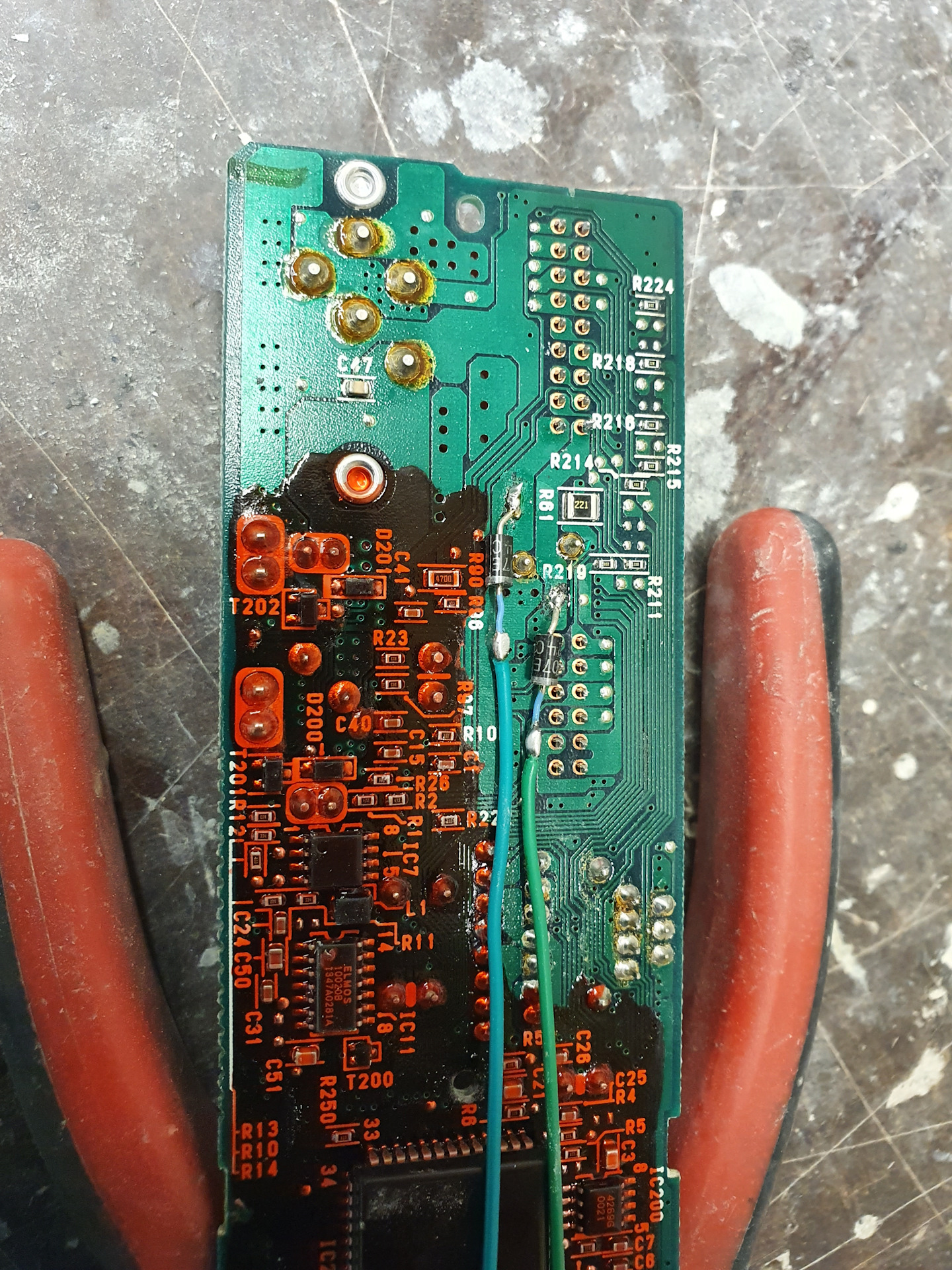 Припаять синий провод в полумиллиметровом пространстве выборки микросхемы (синий провод) мне так и не удалось. При сборке блока провод отваливался. Поэтому прозвонив нашёл ещё 2 точки наиболее приемлемые для пайки. Это точка S — 4й переход на схеме если смотреть по фото справа налево. И продолжение дороги под цепочкой сопротивлений -точка L. Сразу за последним сопротивлением переход дороги на лицевую сторону платы. Фот к сожалению не сделал, по припаялся именно туда.