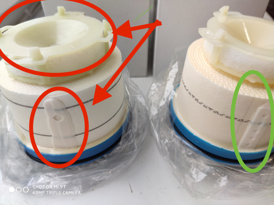Вообще то у того фильтра который слева в картридже бумаги больше намотано и ячейка у него более мелкая. По идее он должен быть оригиналом. Но надо еще ручками пощупать качество бумаги.