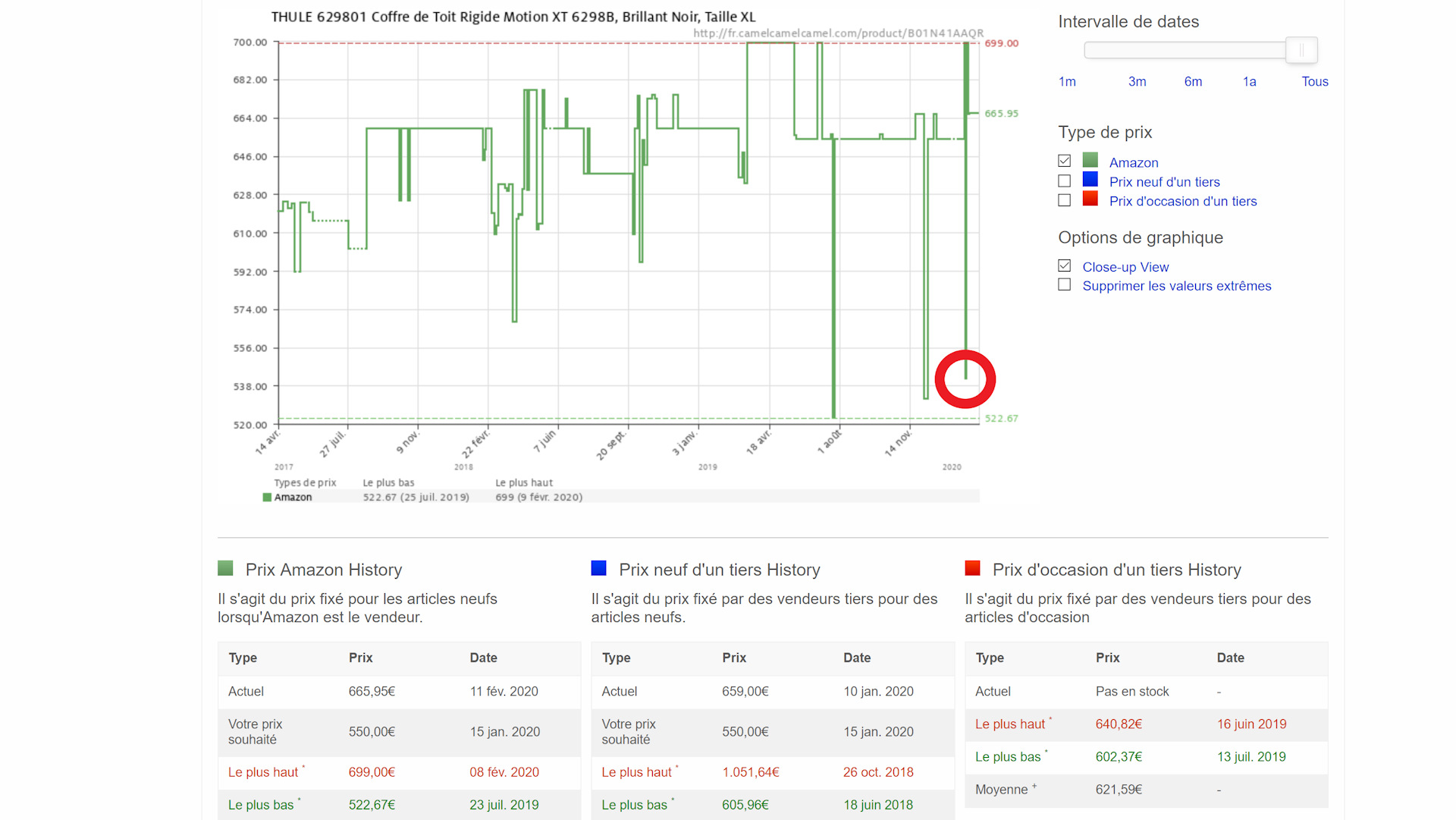 У меня был вариант для этих зимних каникул одолжить бокс у приятеля. Но тут неожиданно сильно упала цена на Thule Motion XT XL. Кстати, если кто не знает, есть отличный сайт, следящий за изменением цен на Amazon : www.camelcamelcamel.com Сколько раз, благодаря ему, я купил желаемые товары по низкой цене – не счесть. Конкретно по боксу – цена на него упала почти до исторического минимума. €541.32 сам бокс + €19.90 за доставку. Сегодня он продается за €665, а я «урвал» его на примерно €120 дешевле. Ну не красота ли?