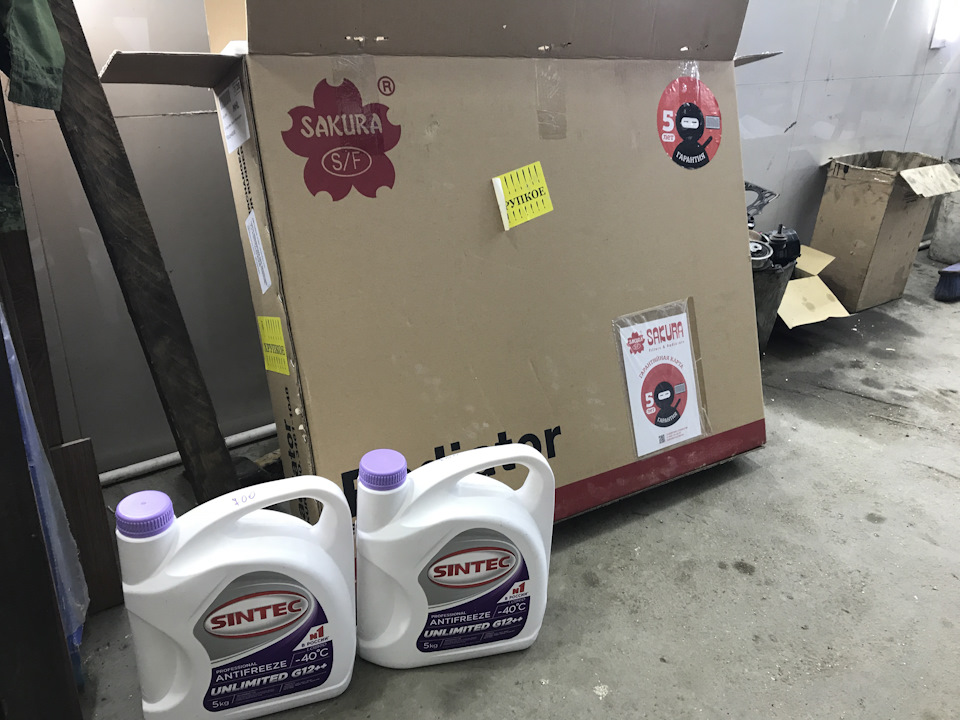 4. Вынужденно поменял радиатор, так как родной потек еще до попадания в мои руки, и с каждым днем капало все интенсивнее. Скажу честно, не увидел необходимости вкладывается в оригинал или Denso, взял просто Sakuru за 8639 руб. Как родной 12 лет наврядли протянет, но на мой век хватит точно)) Плюсом поменял крышечку от Масумы на 0,9 бар. Соответственно залил новый антифриз, взял в магазине по совету продавца Sintec Unlimited G12++ по 700 руб. за 5 литровую канистру.